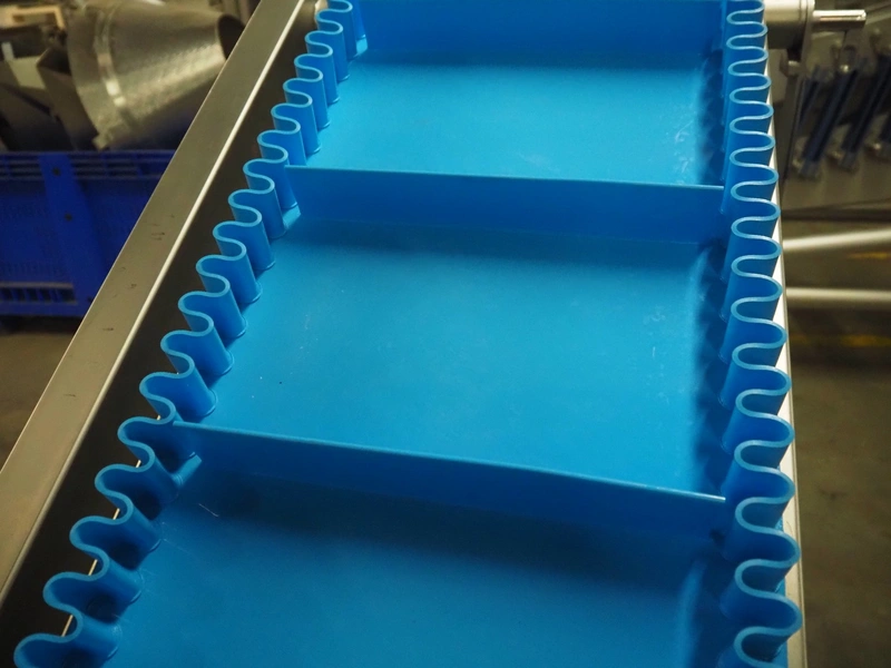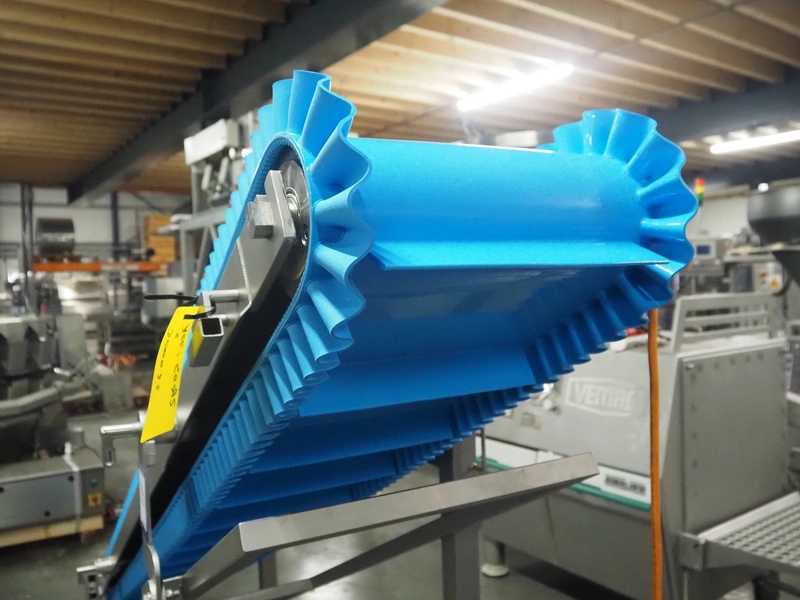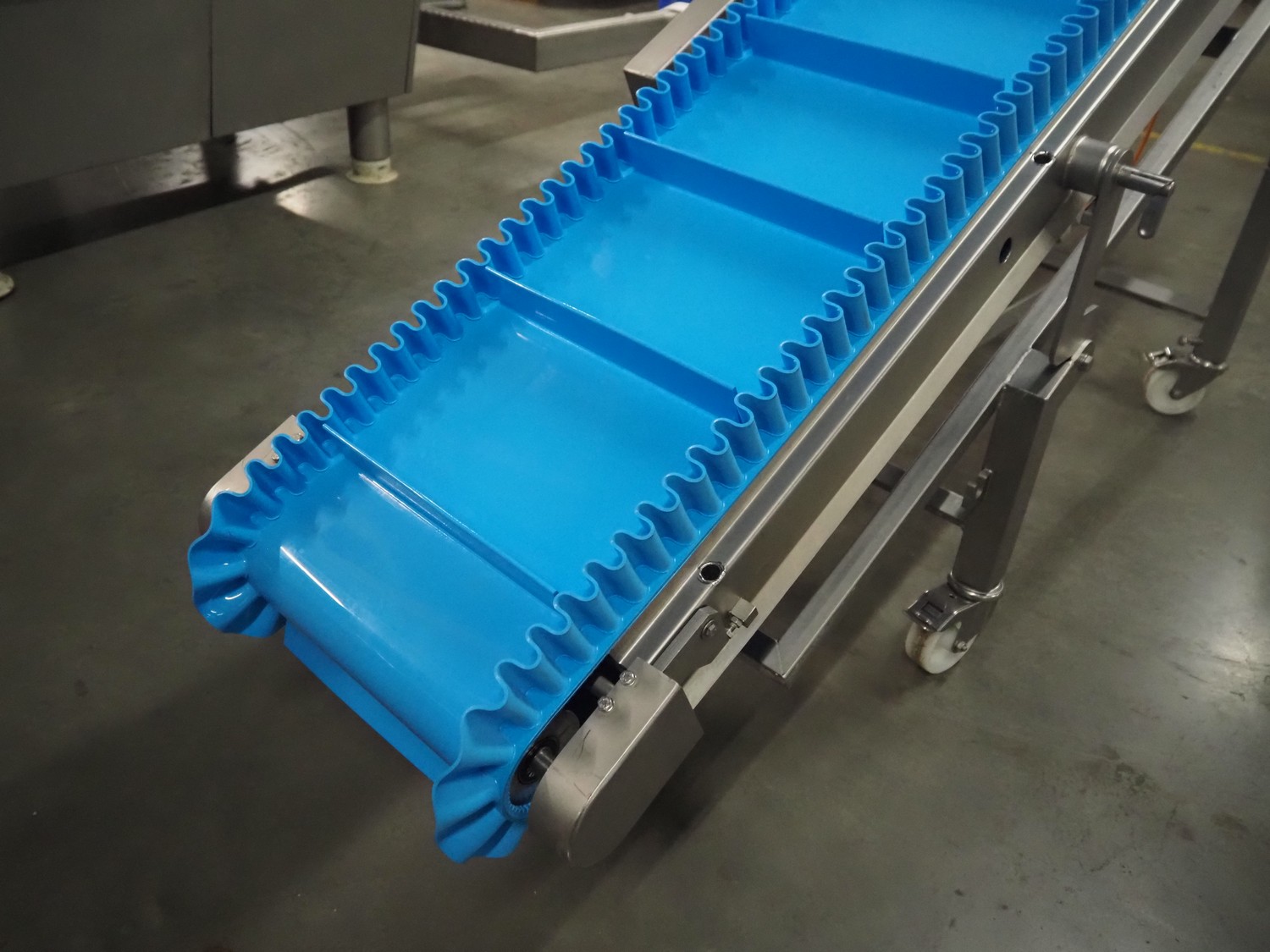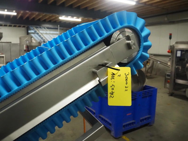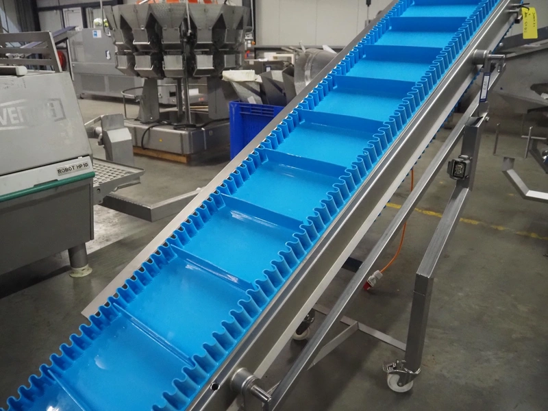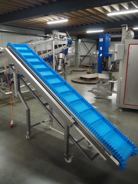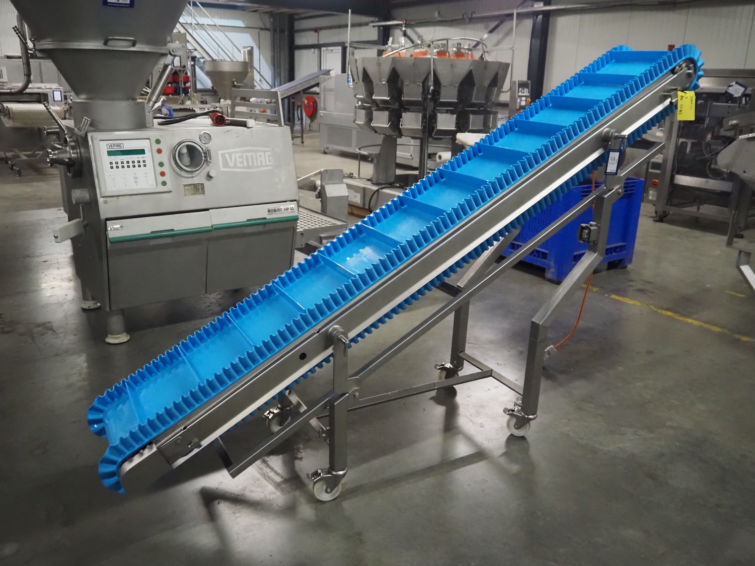 JMB mobile elevating belt, s/s frame, plastic belt with dividers, belt width: 375 mm, distance between dividers: 200 mm, divider height: 45 mm, elevating height: 1600 mm, total dimensions: 2500 mm x 560 mm x 1640 mm.