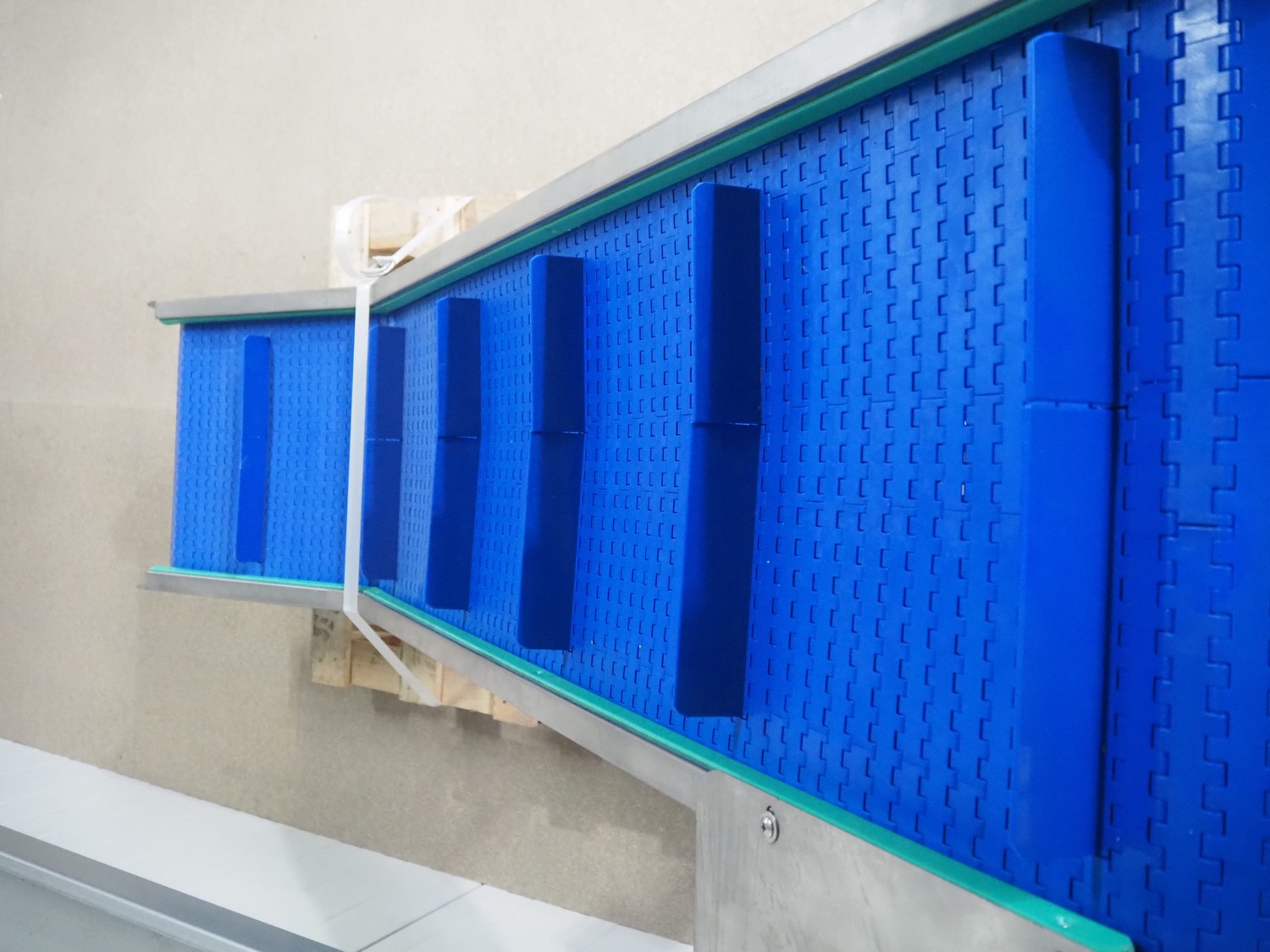 Elevating belt, plastic belt with dividers, belt width: 440 mm, divider height: 50 mm, distance between dividers: 260 mm, elevating height: 880 mm, total dimensions: 1600 mm x 600 mm x 900 mm.
