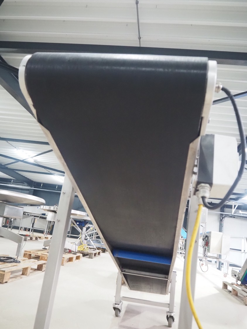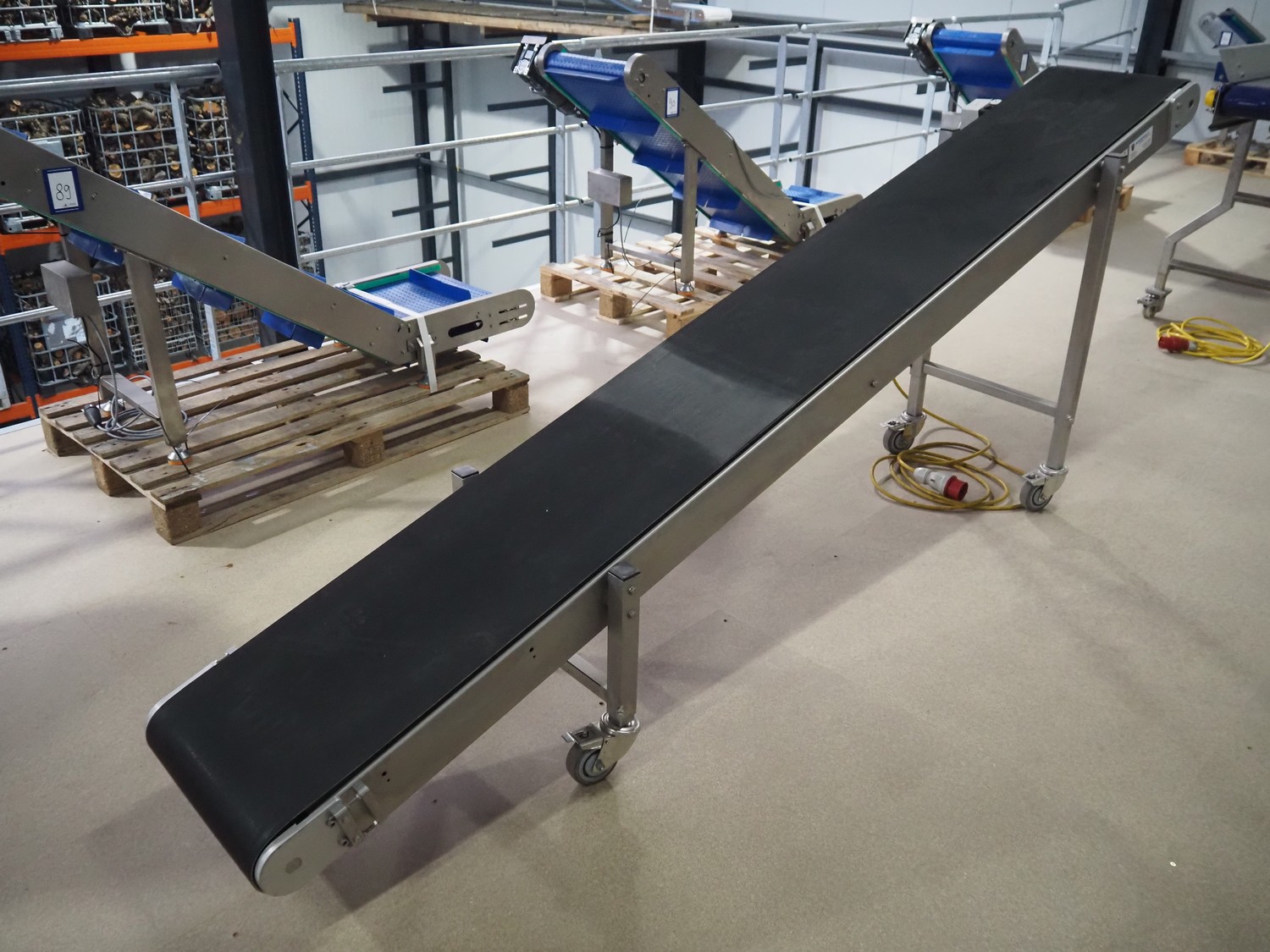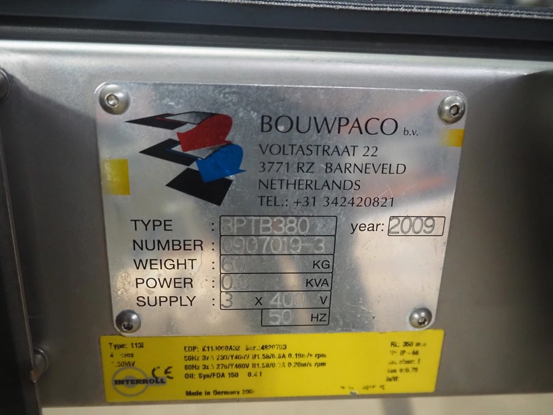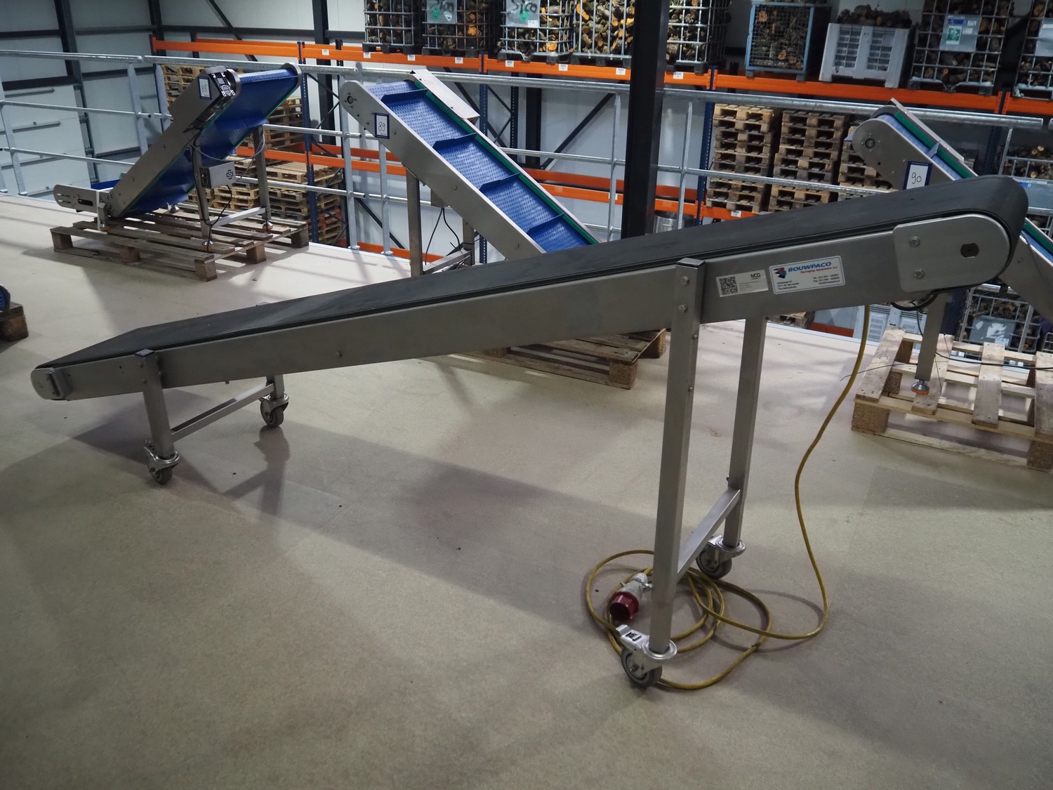 Bouwpaco B.V. mobile elevating belt, type: BPTB380, number: 0907019-3, year of construction: 2009, 400 V, 3 Ph, 50 Hz, 0.3 KVA, weight: 60 kg, s/s frame, plastic belt, belt width: 300 mm, total dimensions: 550 mm x 2850 mm x 1100 mm.
