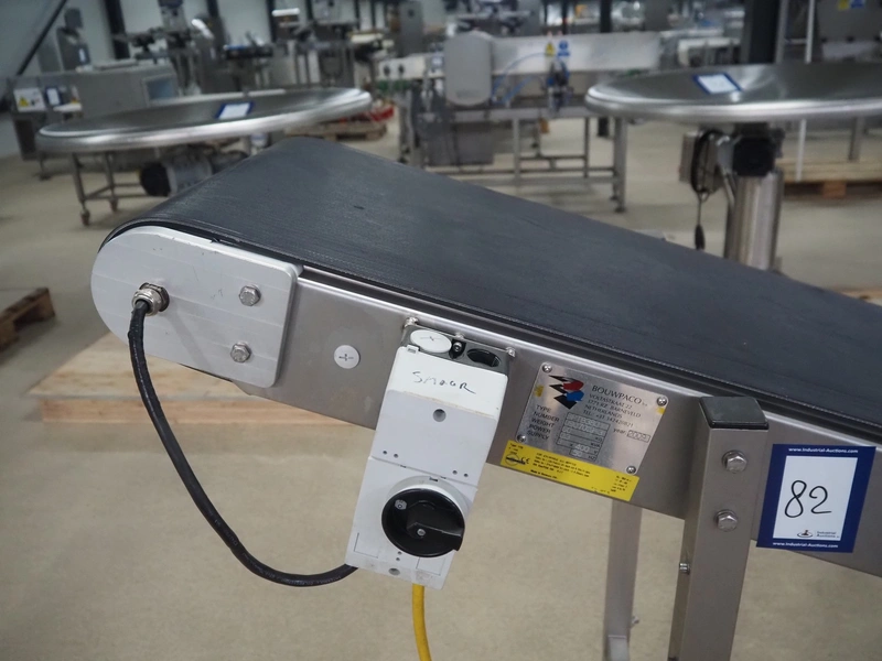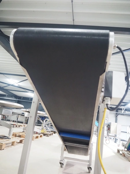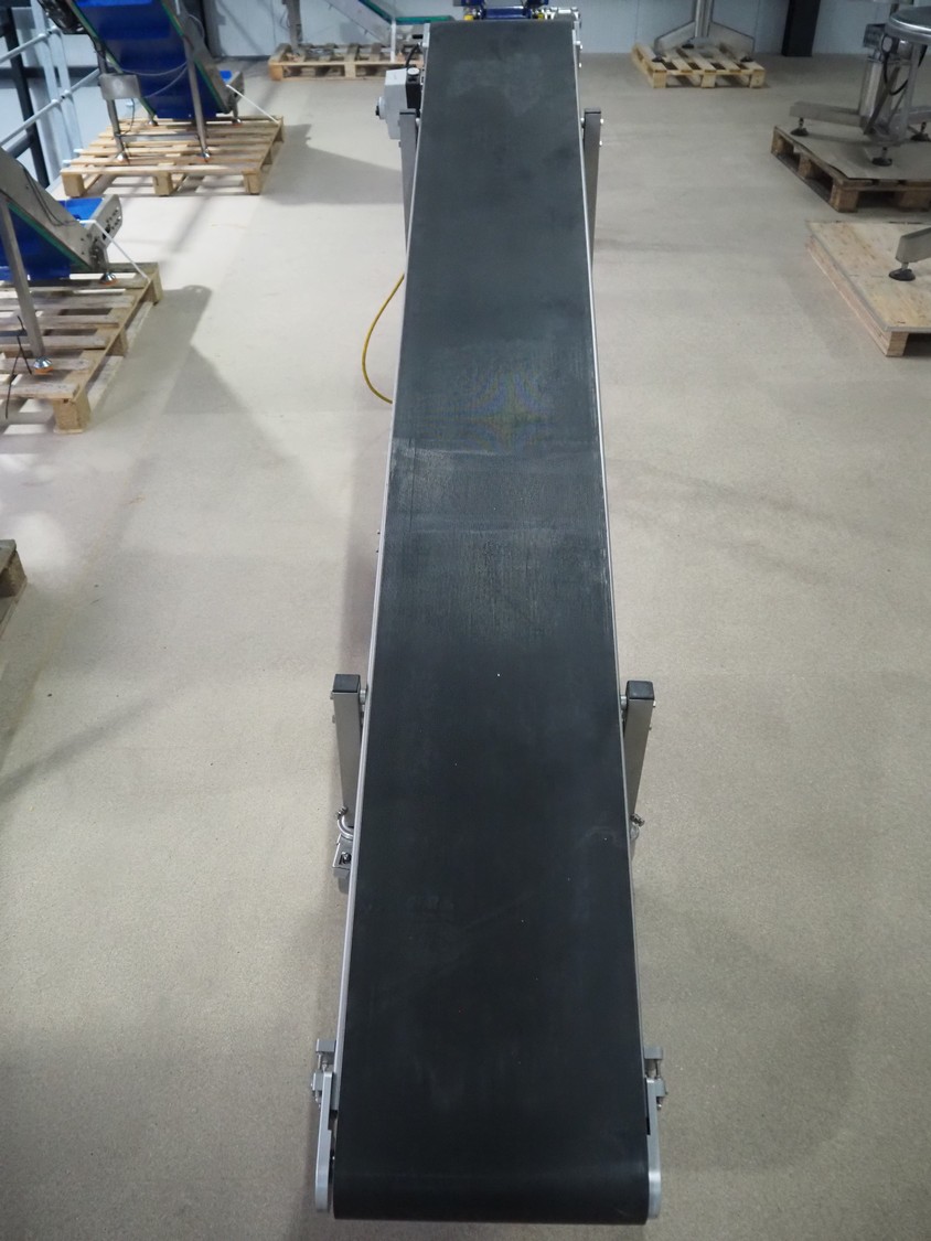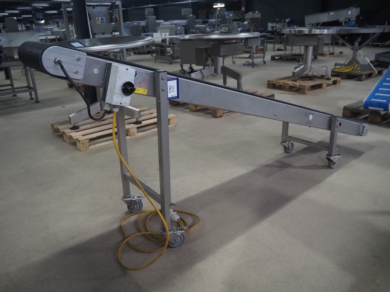 Bouwpaco B.V. mobile elevating belt, type: BPTB380, number: 0907019-3, year of construction: 2009, 400 V, 3 Ph, 50 Hz, 0.3 KVA, weight: 60 kg, s/s frame, plastic belt, belt width: 300 mm, total dimensions: 550 mm x 2850 mm x 1100 mm.