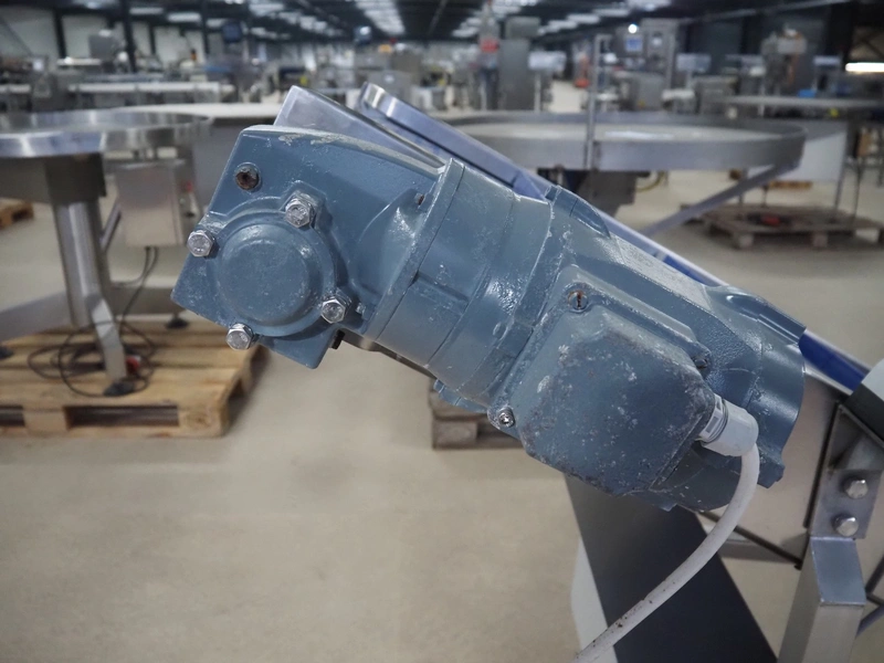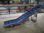 Mobile elevating belt, plastic belt with dividers, s/s frame, belt width: 445 mm, divider height: 27 mm, distance between dividers: 230 mm, elevating height: 1150 mm, total dimensions: 2650 mm x 780 mm x 1200 mm.