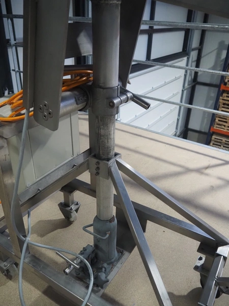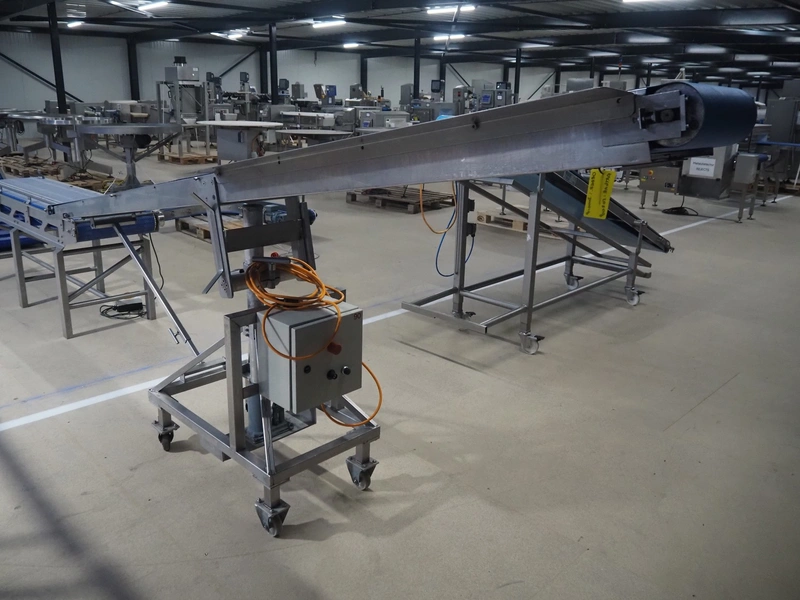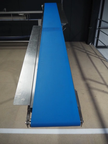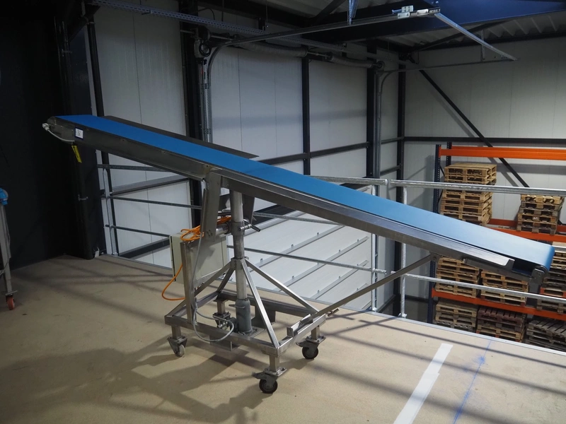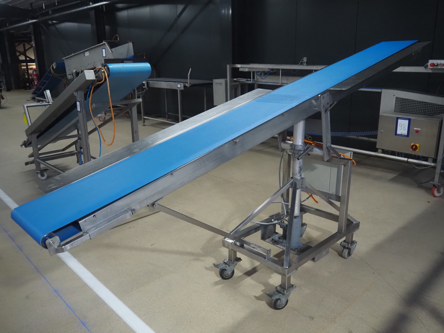 Mobile adjustable elevating belt, plastic belt, belt width: 300 mm, total dimensions: 3200 mm x 580 mm x 1520 mm.