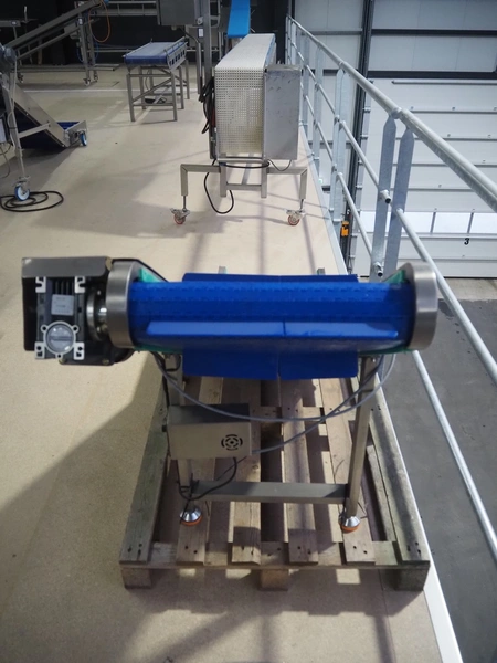 Elevating belt, plastic belt with dividers, belt width: 440 mm, divider height: 50 mm, distance between dividers: 260 mm, elevating height: 880 mm, total dimensions: 1600 mm x 600 mm x 900 mm.