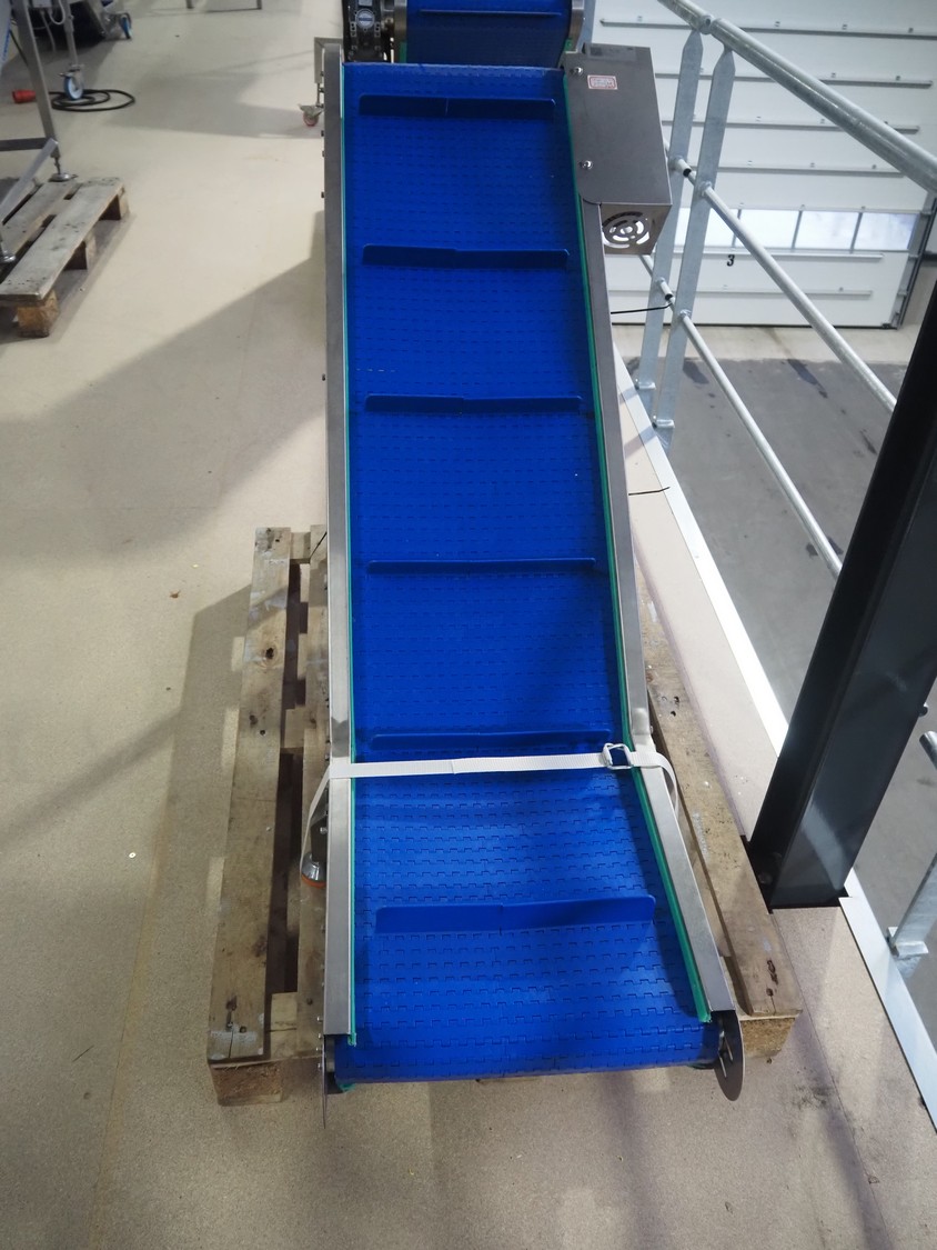 Elevating belt, plastic belt with dividers, belt width: 440 mm, divider height: 50 mm, distance between dividers: 260 mm, elevating height: 880 mm, total dimensions: 1600 mm x 600 mm x 900 mm.