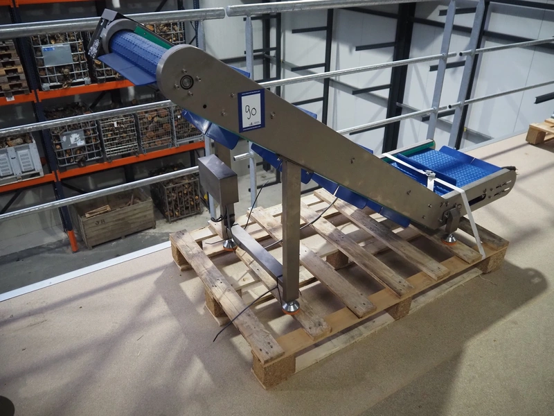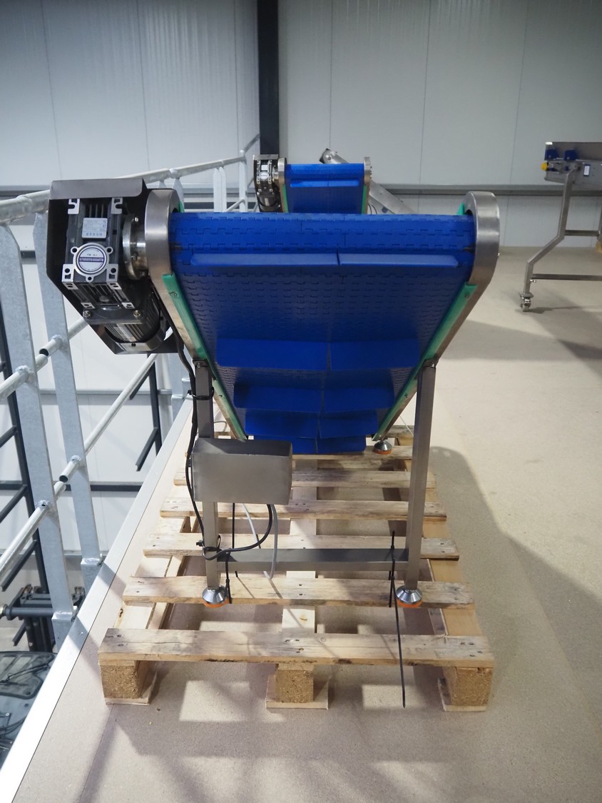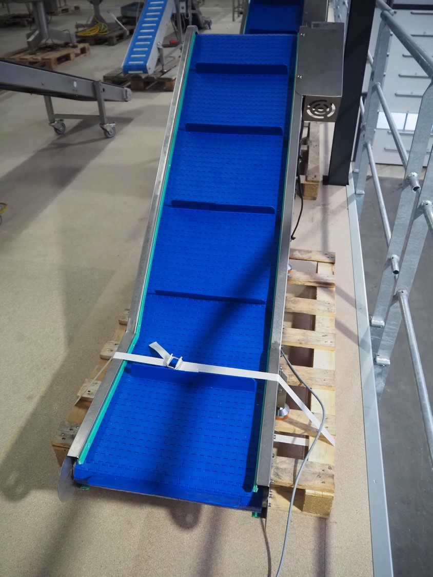 Elevating belt, plastic belt with dividers, belt width: 440 mm, divider height: 50 mm, distance between dividers: 260 mm, elevating height: 880 mm, total dimensions: 1600 mm x 600 mm x 900 mm.