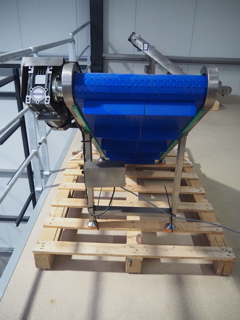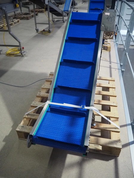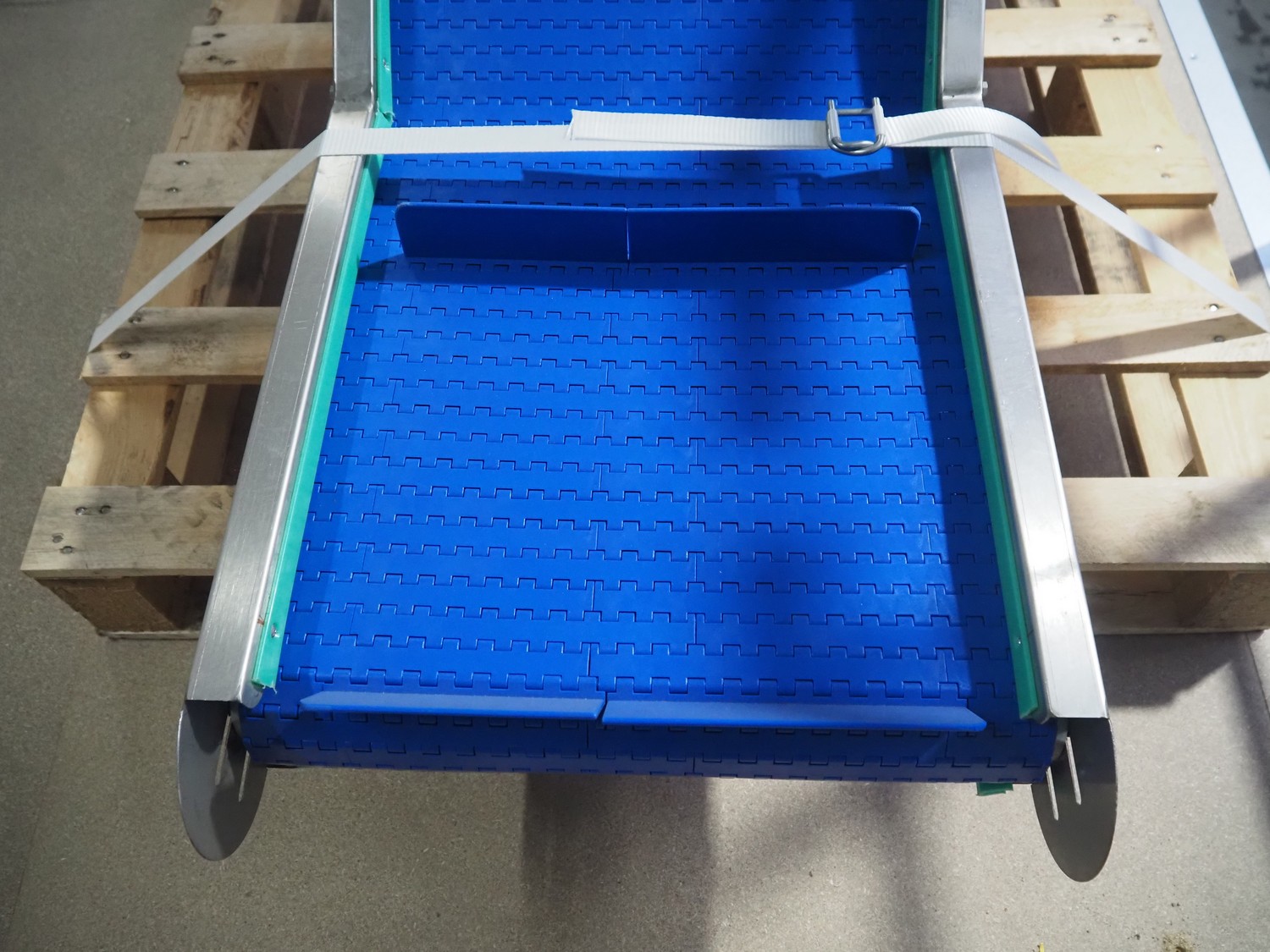 Elevating belt, plastic belt with dividers, belt width: 440 mm, divider height: 50 mm, distance between dividers: 260 mm, elevating height: 880 mm, total dimensions: 1600 mm x 600 mm x 900 mm.