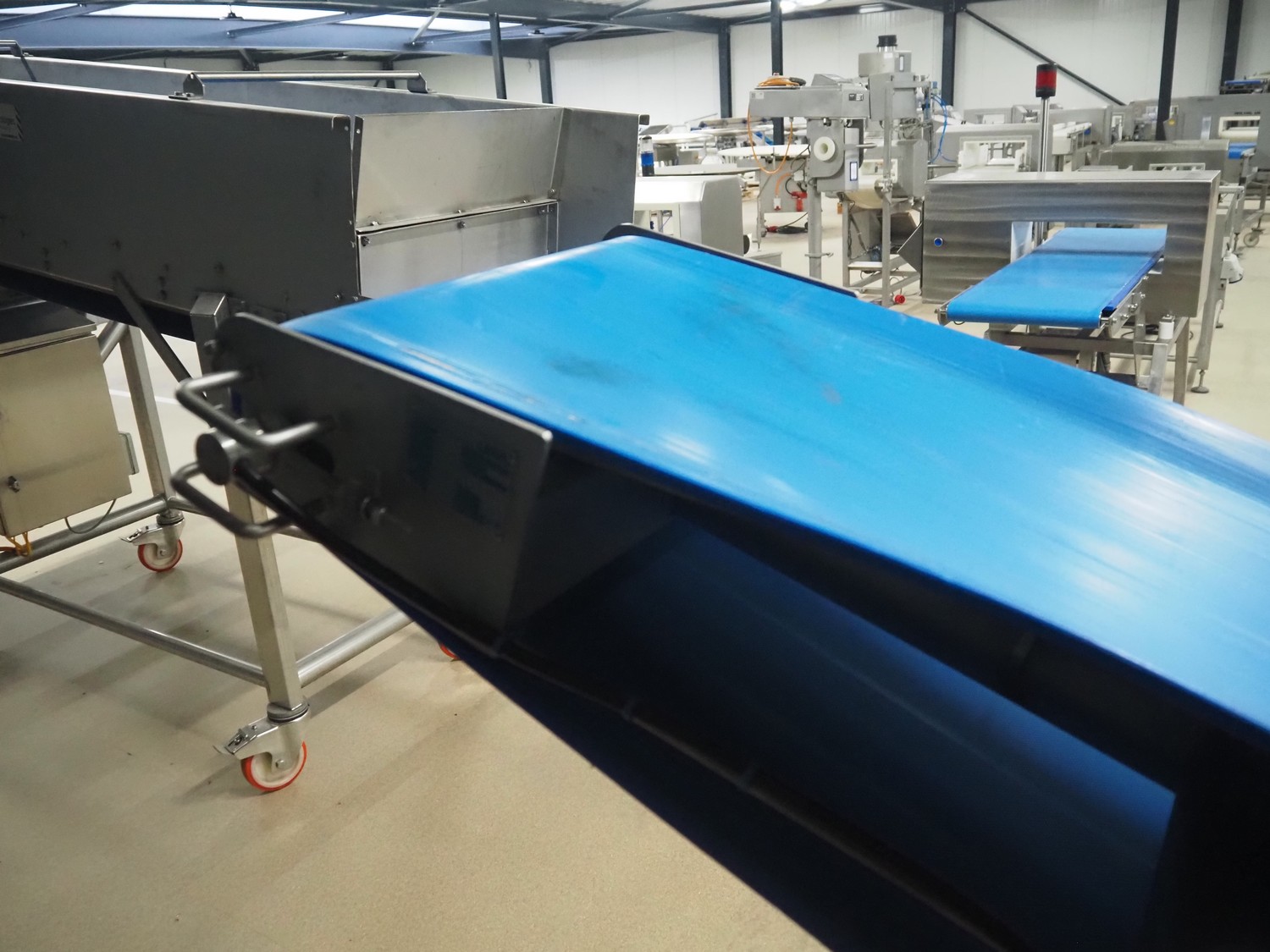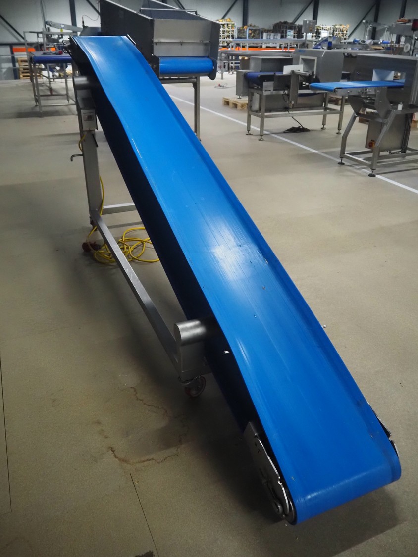Mobile elevating belt, plastic belt, belt width: 400 mm, elevating height: 1350 mm, total dimensions: 3300 mm x 600 mm x 1340 mm.