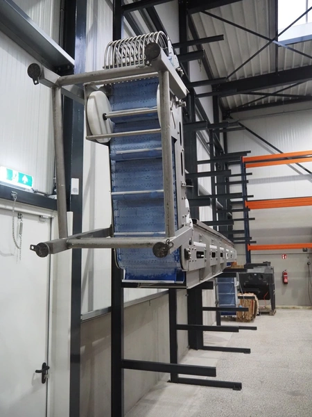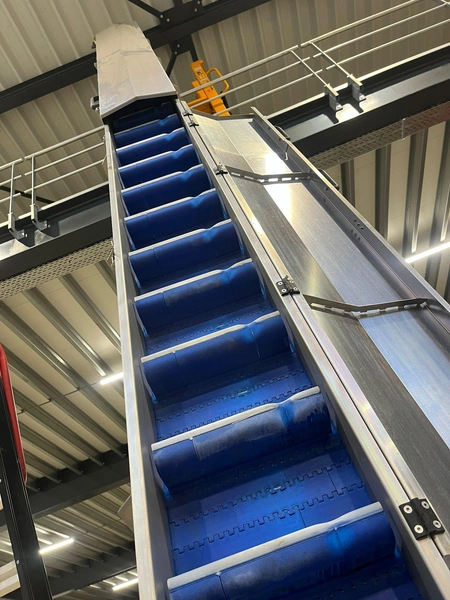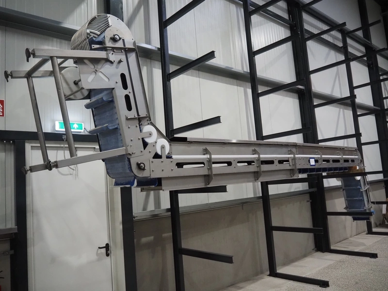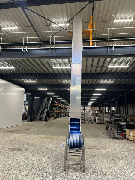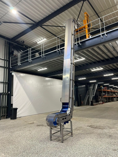 Elevating belt, plastic belt with dividers, belt width: 380 mm, divider height: 110 mm, distance between dividers: 200 mm, elevating height: 7200 mm, total dimensions: 3000 mm x 650 mm x 7400 mm.