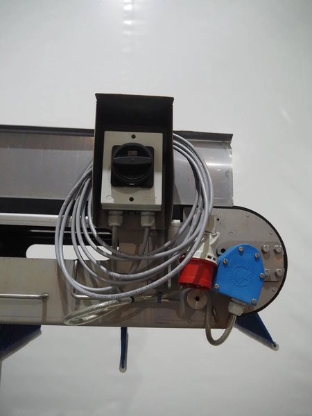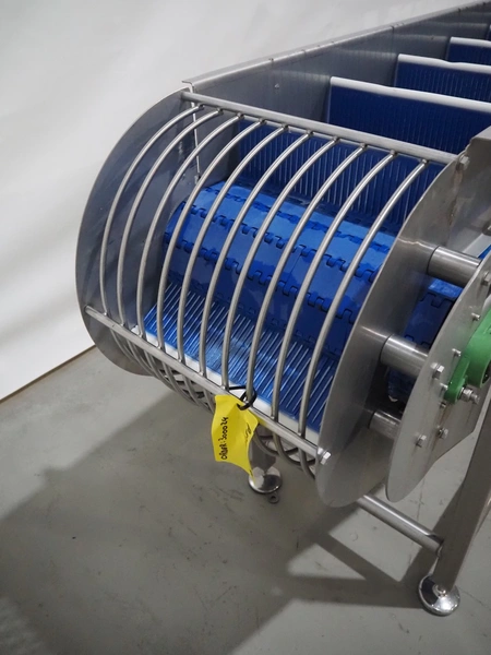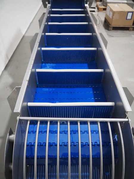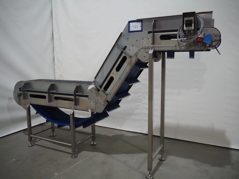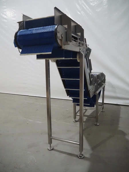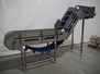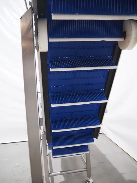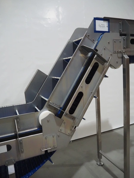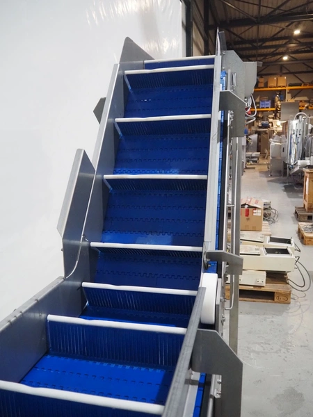 Elevating belt, s/s frame, plastic belt with dividers, belt width: 400 mm, distance between dividers: 250 mm, divider height: 100 mm, elevating height: 1800 mm, total dimensions: 3600 mm x 600 mm x 2000 mm.