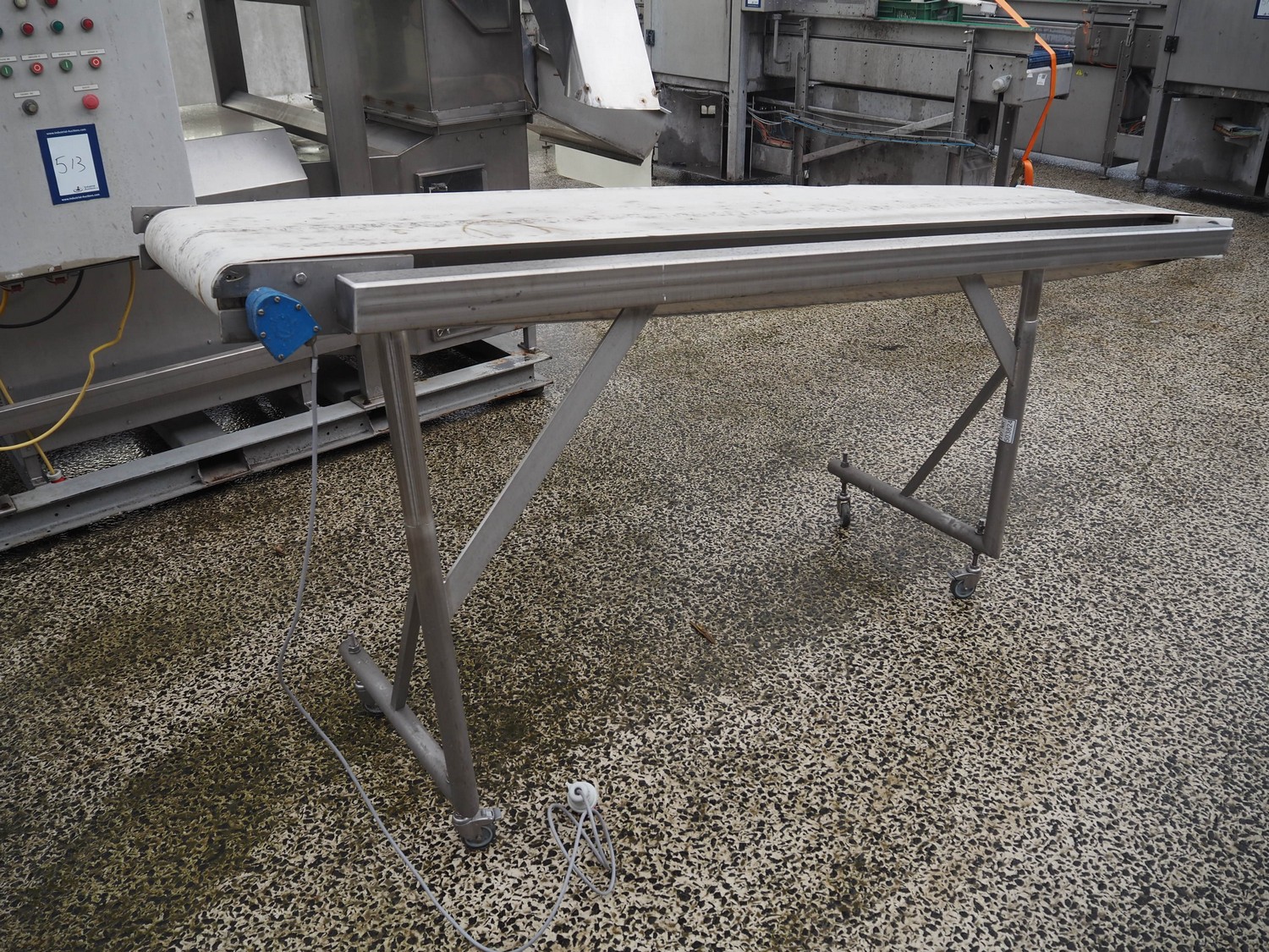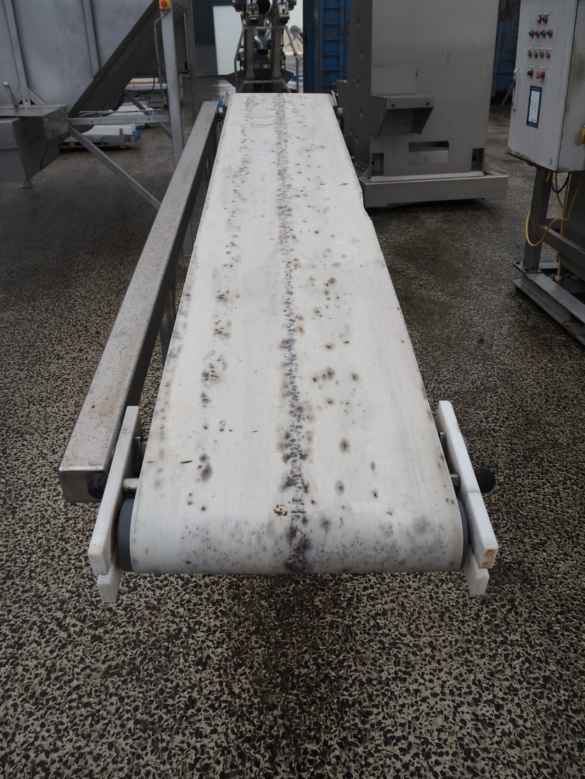 Mobile elevating belt, s/s frame, plastic belt, belt width: 485 mm, elevating height: 1300 mm, total dimensions: 3000 mm x 700 mm x 1300 mm.