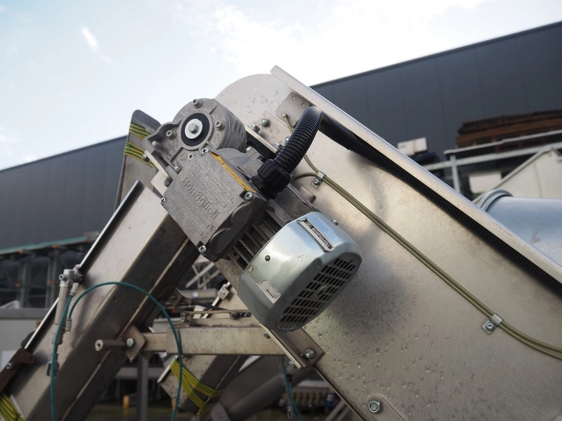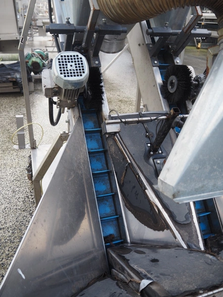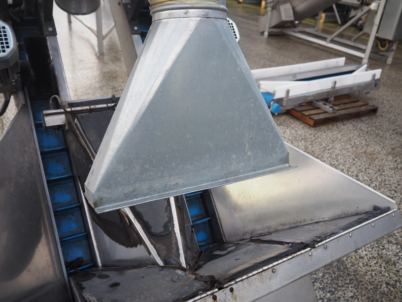 Claypack mobile 2 lane elevating belt, type: CPC, number: 8300, year of construction: 2019, plastic belts with dividers, belt width: (2x) 100 mm, divider height: 50 mm, distance between dividers: 95 mm, elevating height: 2100 mm, total dimensions: 2700 mm x 1300 mm x 2250 mm.