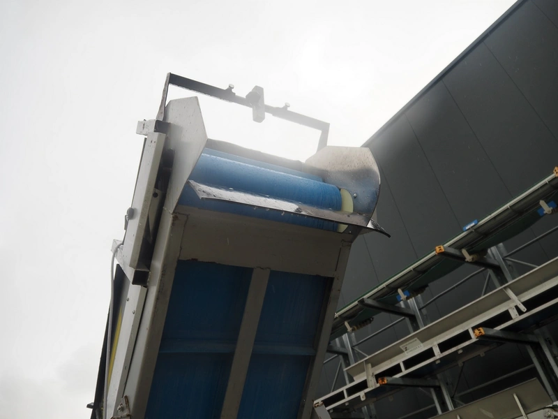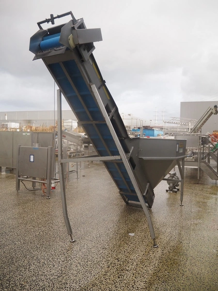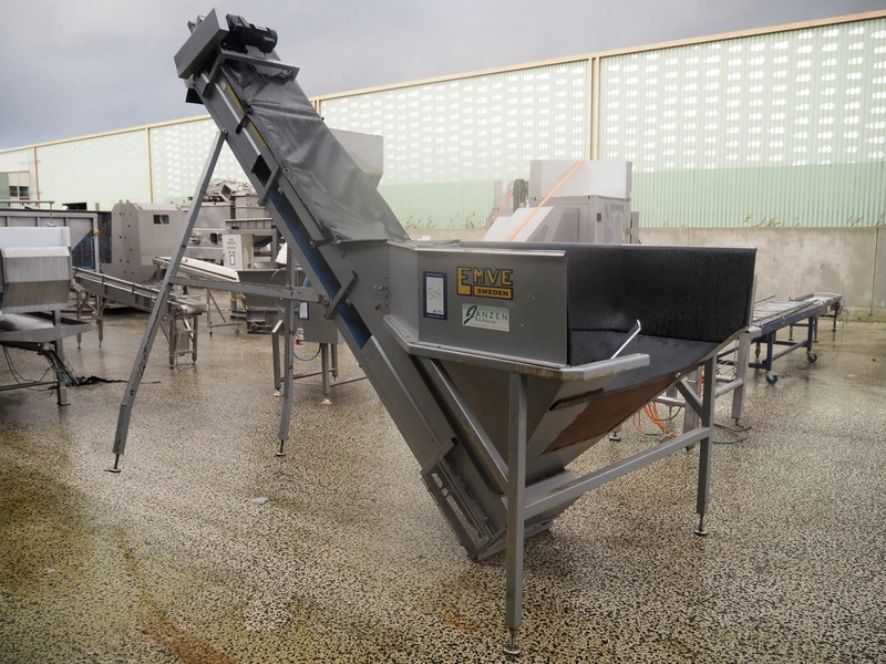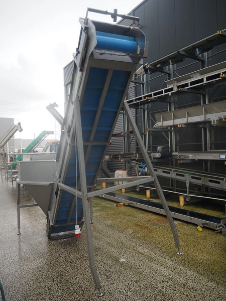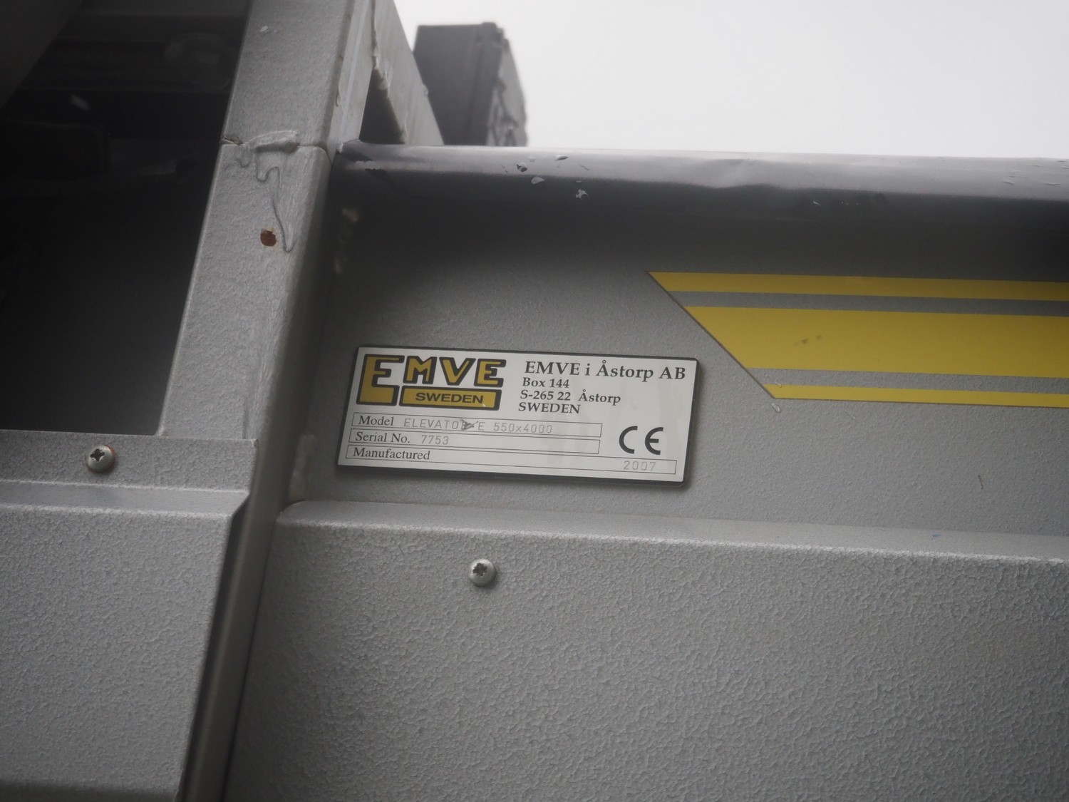EMVE i Astorp AB elevating belt, model: Elevato E 550x4000, serial number: 7753, year of construction: 2007, plastic belt with dividers, belt width: 560 mm, divider height: 50 mm, distance between dividers: 300 mm, elevating height: 2900 mm, total dimensions: 4000 mm x 1750 mm x 3200 mm.