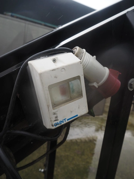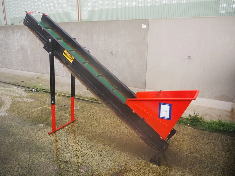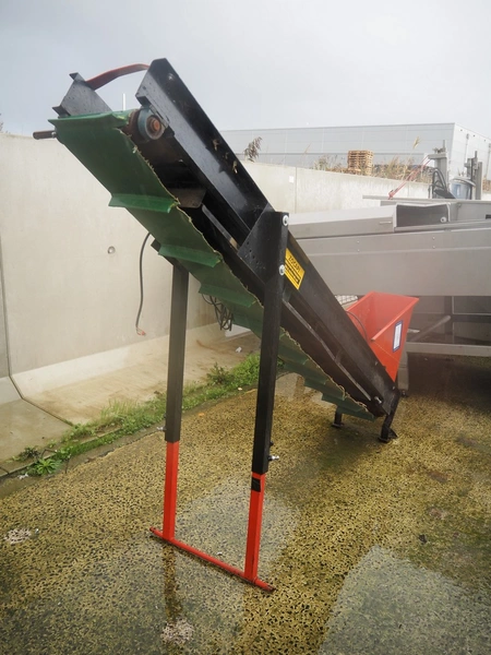 Elevating belt, plastic belt with dividers, belt width: 300 mm, divider height: 40 mm, distance between dividers: 300 mm, elevating height: 1750 mm, total dimensions: 2700 mm x 450 mm x 1900 mm.