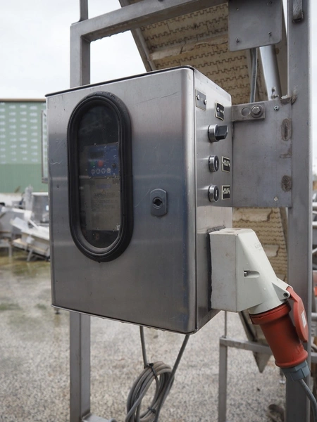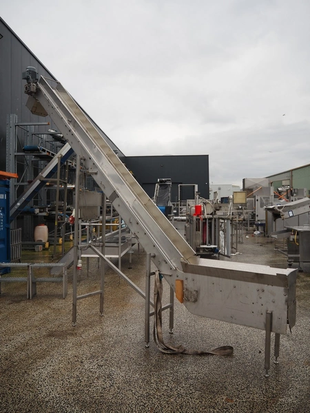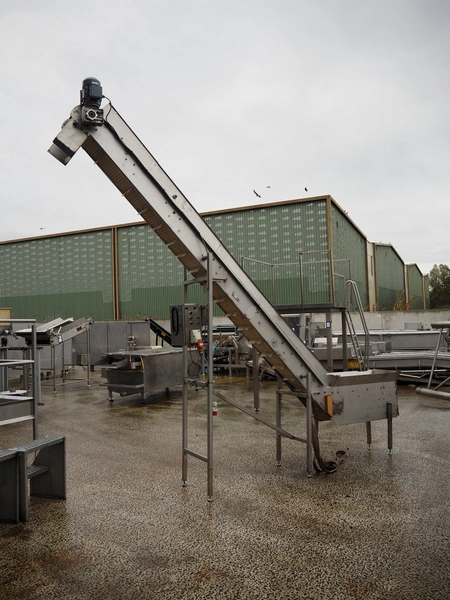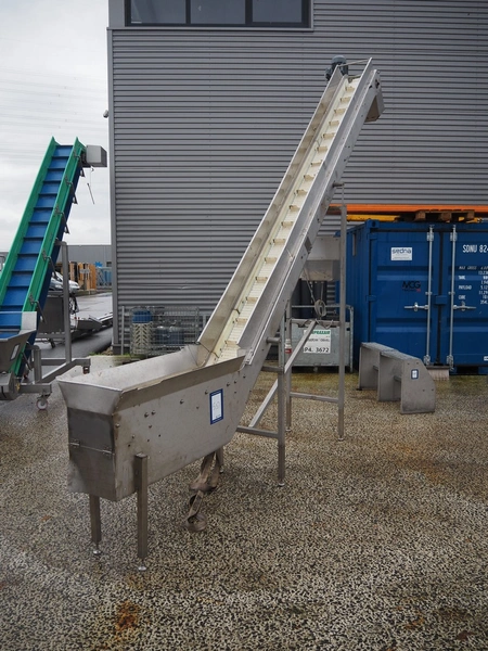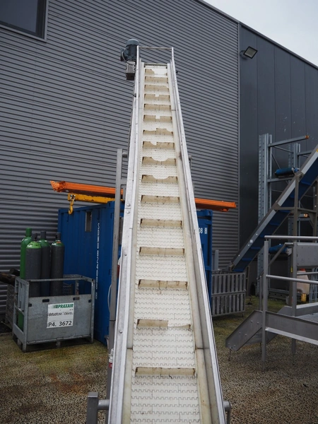 Elevating belt, plastic belt with dividers, belt width: 250 mm, divider height: 50 mm, distance between dividers: 200 mm, elevating height: 3400 mm, total dimensions: 4250 mm x 600 mm x 3600 mm.