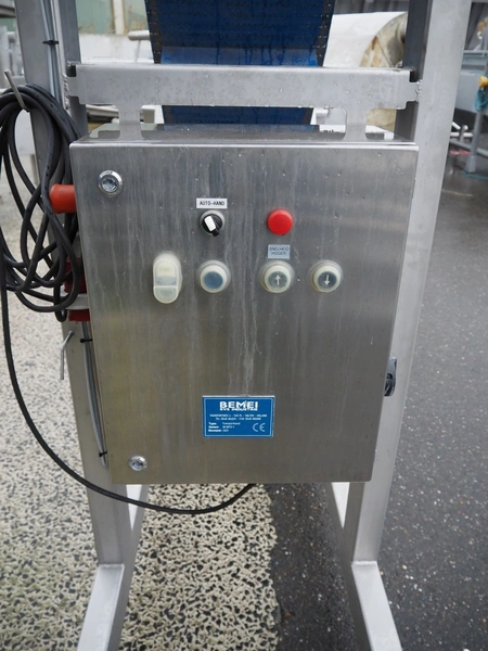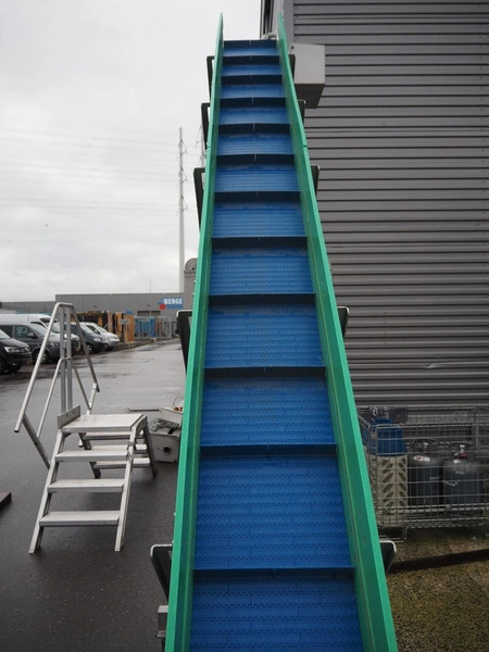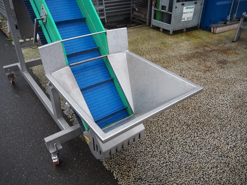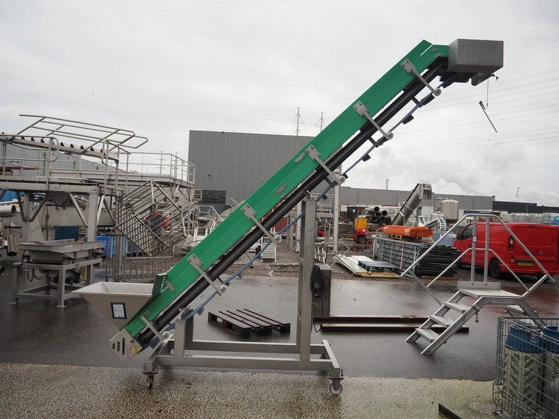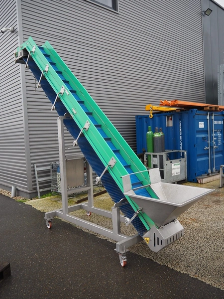 Bemei mobile elevating belt, serial number: 30.9673-1, year of construction: 2021, plastic belt with dividers, plastic belt, belt width: 400 mm, divider height: 50 mm, distance between dividers: 285 mm, elevating height: 3500 mm, total dimensions: 4200 mm x 1000 mm x 3700 mm.