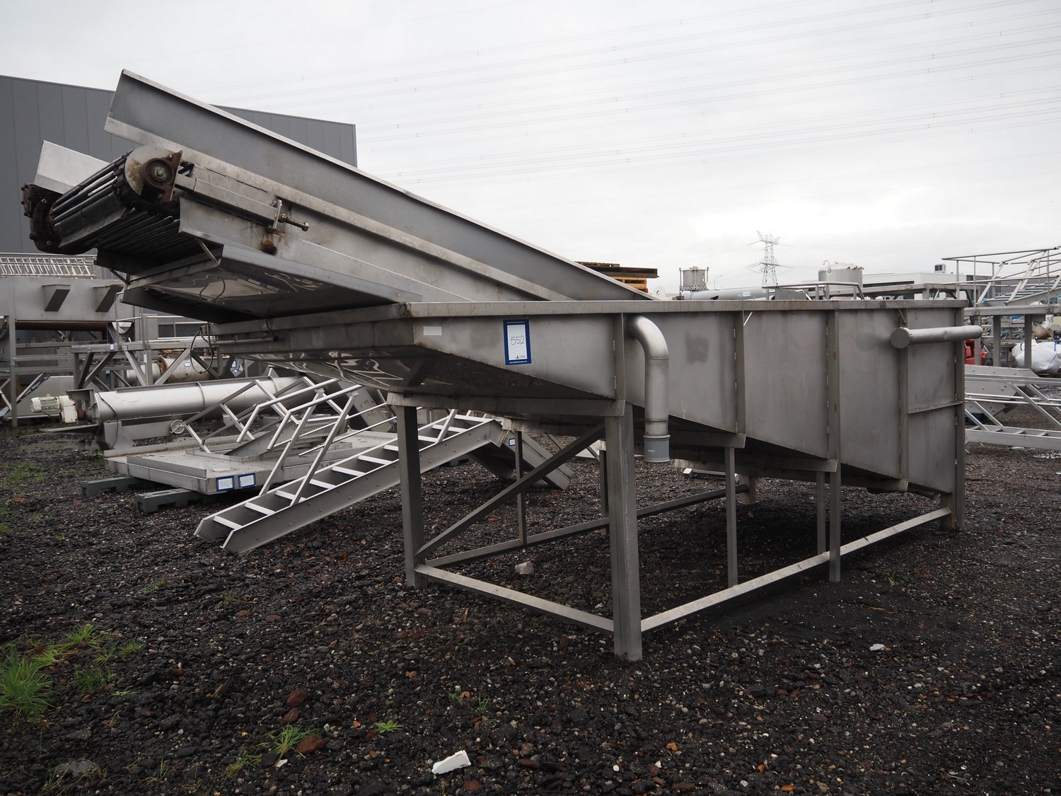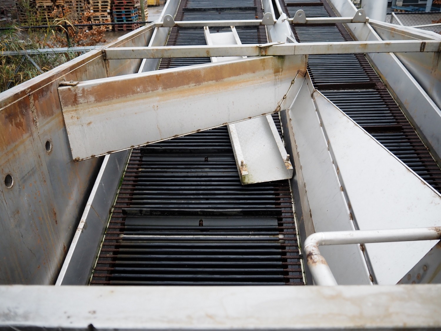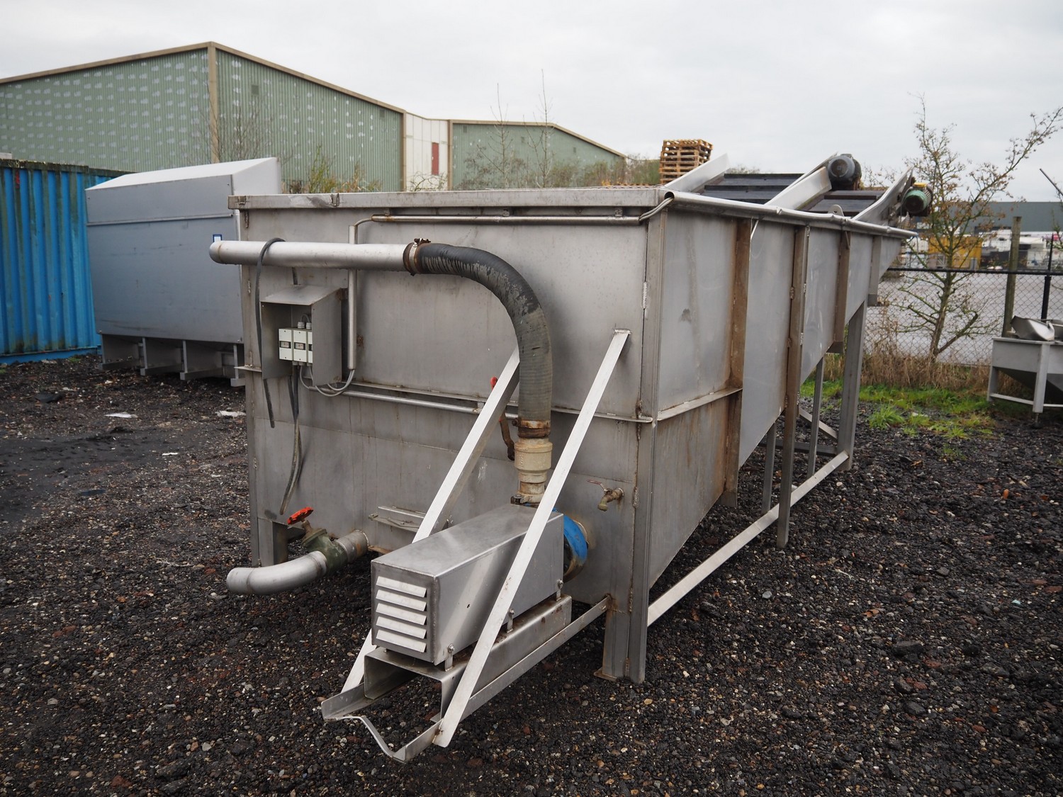 Steel tub used as salt bath with steel elevating belt, belt width: 100 mm and 600 mm, total dimensions: 7100 mm x 2300 mm x 2500 mm.