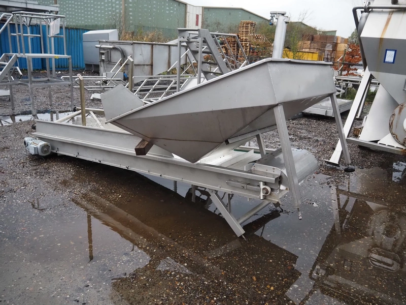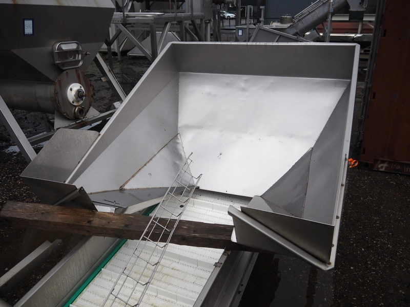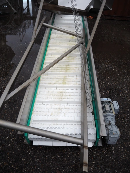 Elevating belt with infeed bunker, s/s frame, plastic belt with dividers, belt width: 700 mm, distance between dividers: 250 mm, divider height: 40 mm, total dimensions: 4400 mm x 1500 mm x 1650 mm.