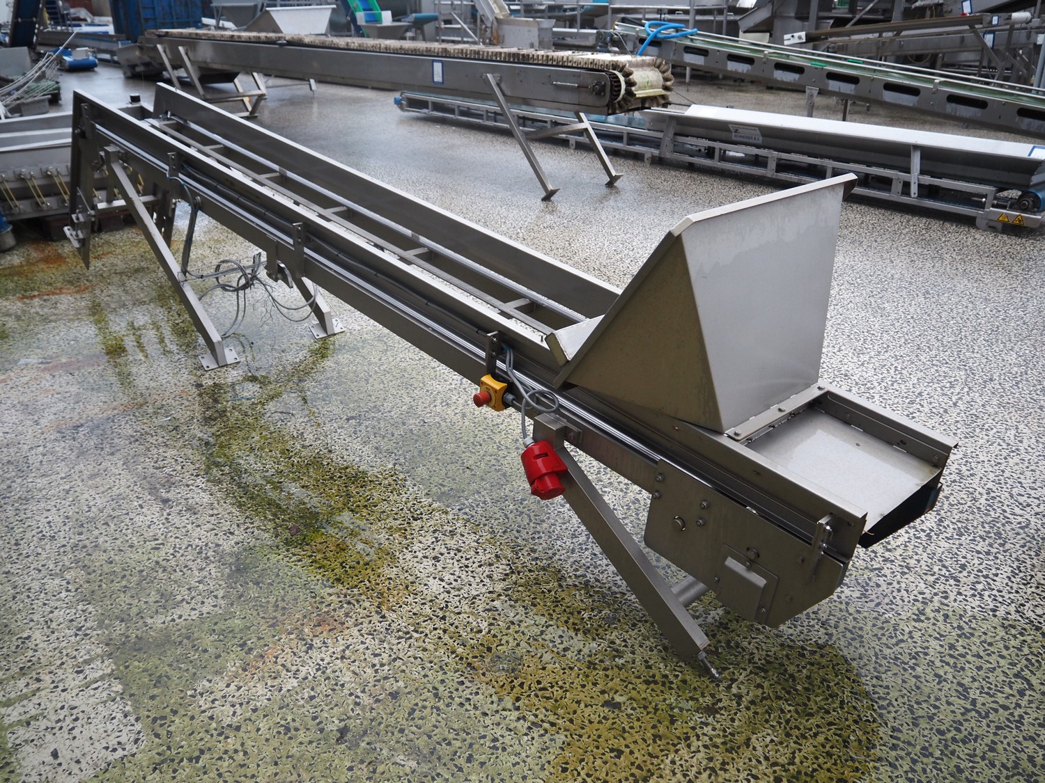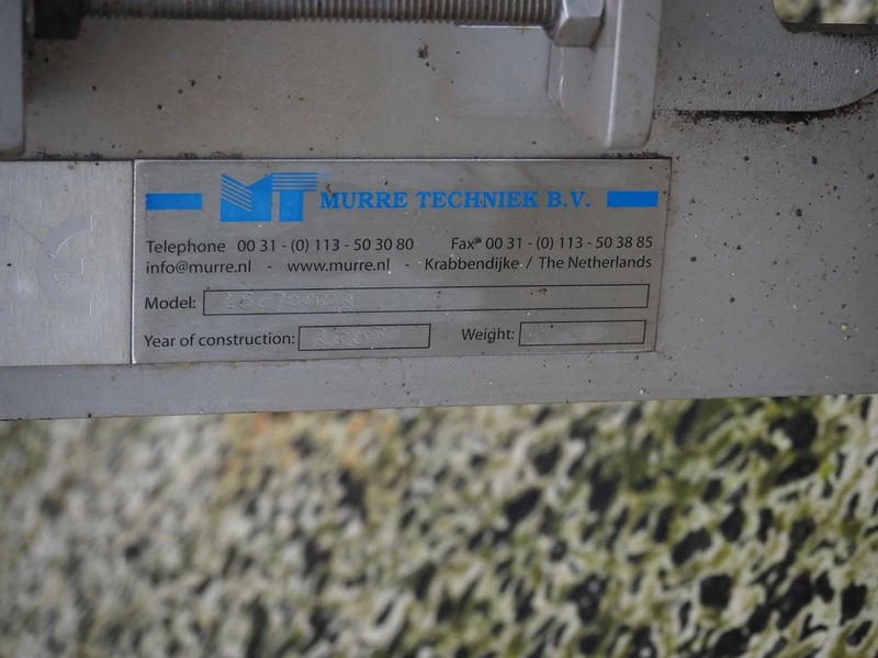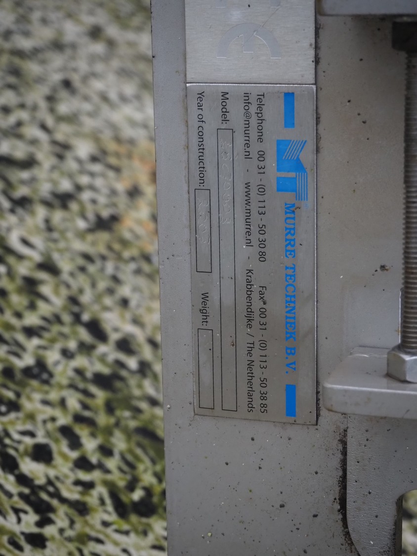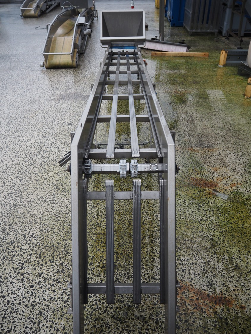 Murre Techniek b.v. elevating belt, s/s frame, belt width: 400 mm, total dimensions: 5250 mm x 600 mm x 1100 mm. Missing belt.