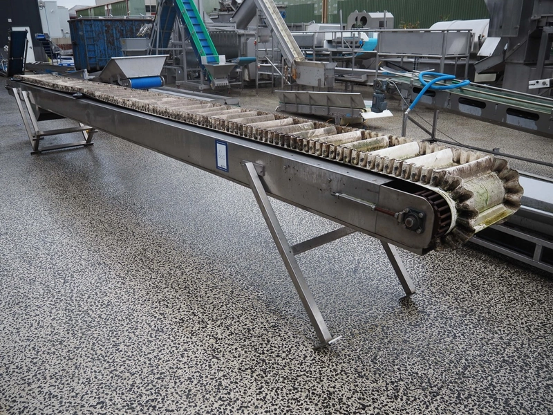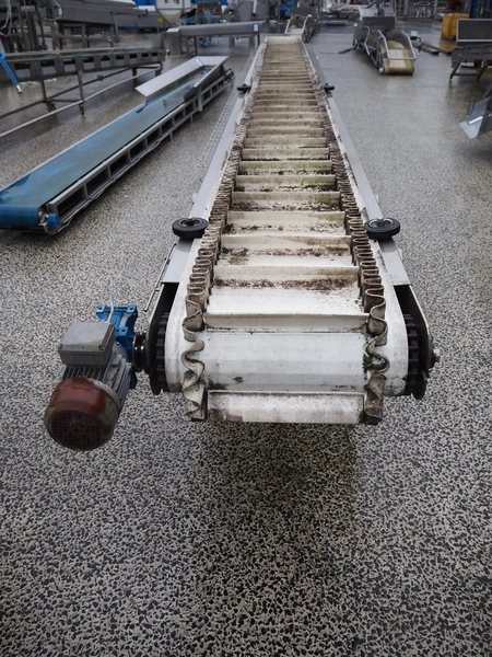 Abracad elevating belt with dividers, type: 9 2000, number: 1206, plastic belt, belt width: 600 mm, distance between dividers: 170 mm, divider height: 80 mm, total dimensions: 8200 mm x 850 mm x 1100 mm.