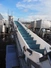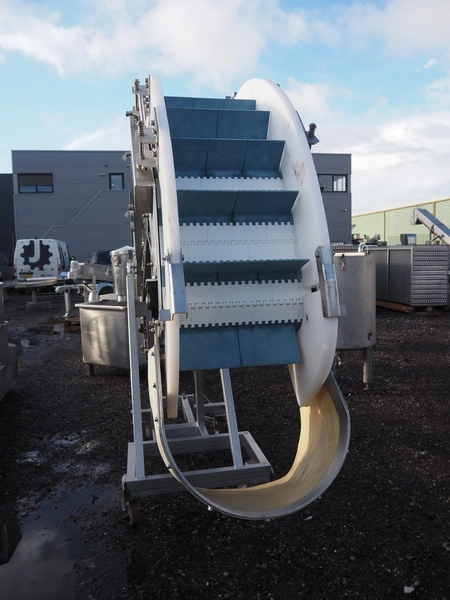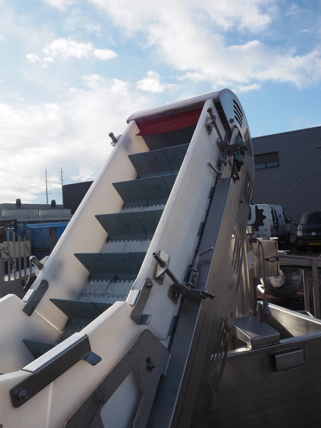 Mobile goose neck elevating belt, s/s frame, plastic belt with dividers, belt width: 370 mm, distance between dividers: 160 mm, divider height: 100 mm, total dimensions: 5200 mm x 900 mm x 2300 mm.