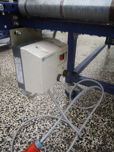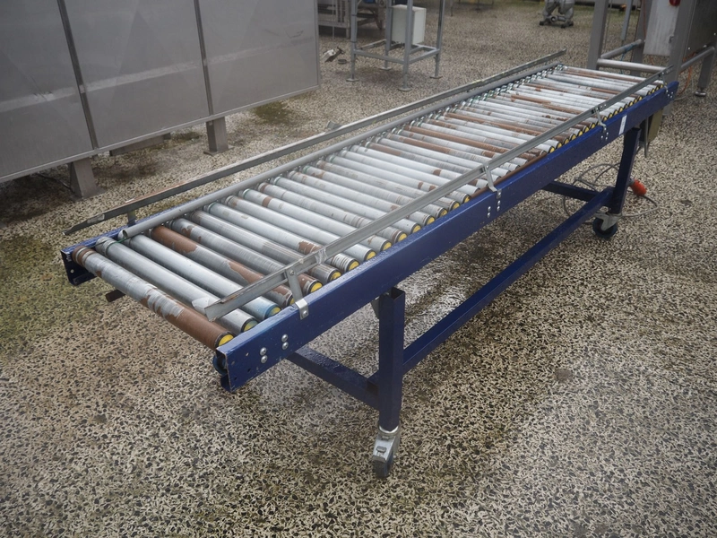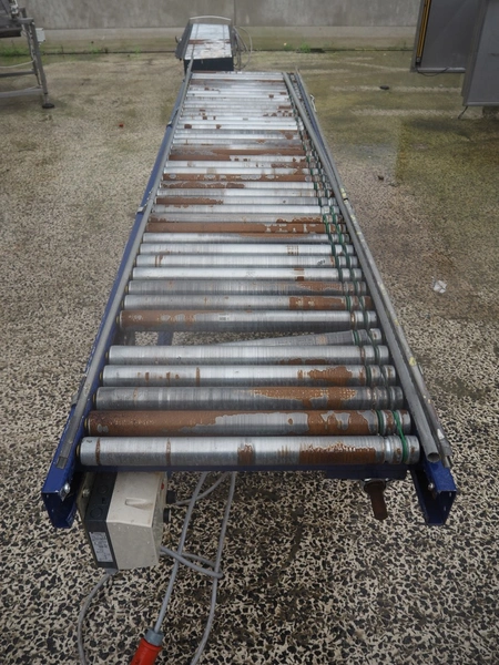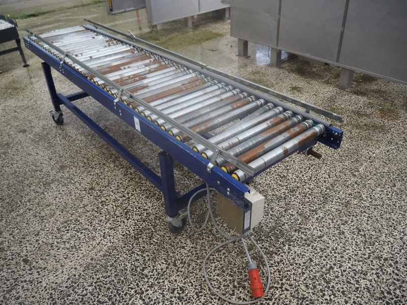 Mobile steel driven roller conveyor, steel rollers, roller width: 600 mm, total dimensions: 3000 mm x 750 mm x 850 mm.