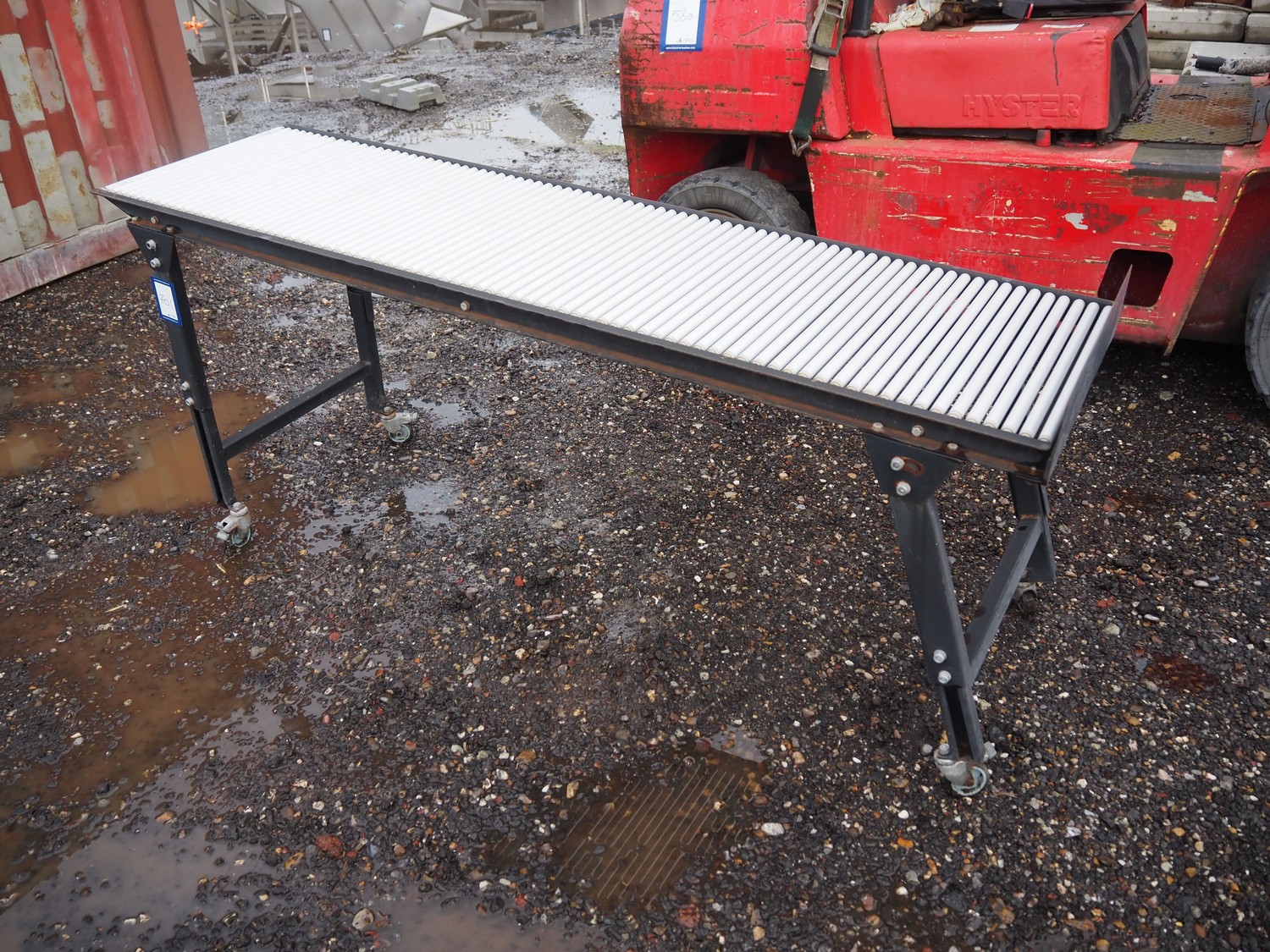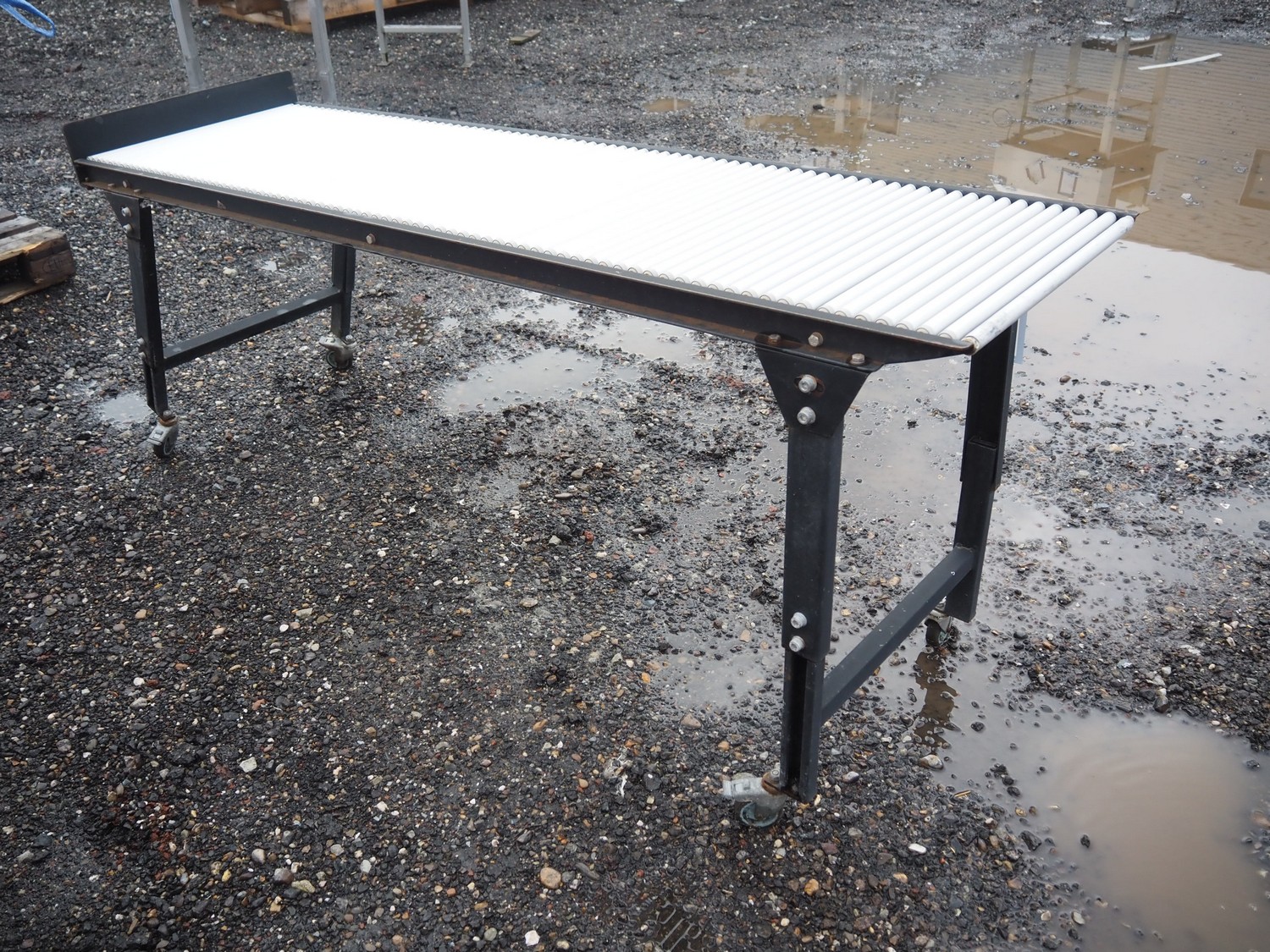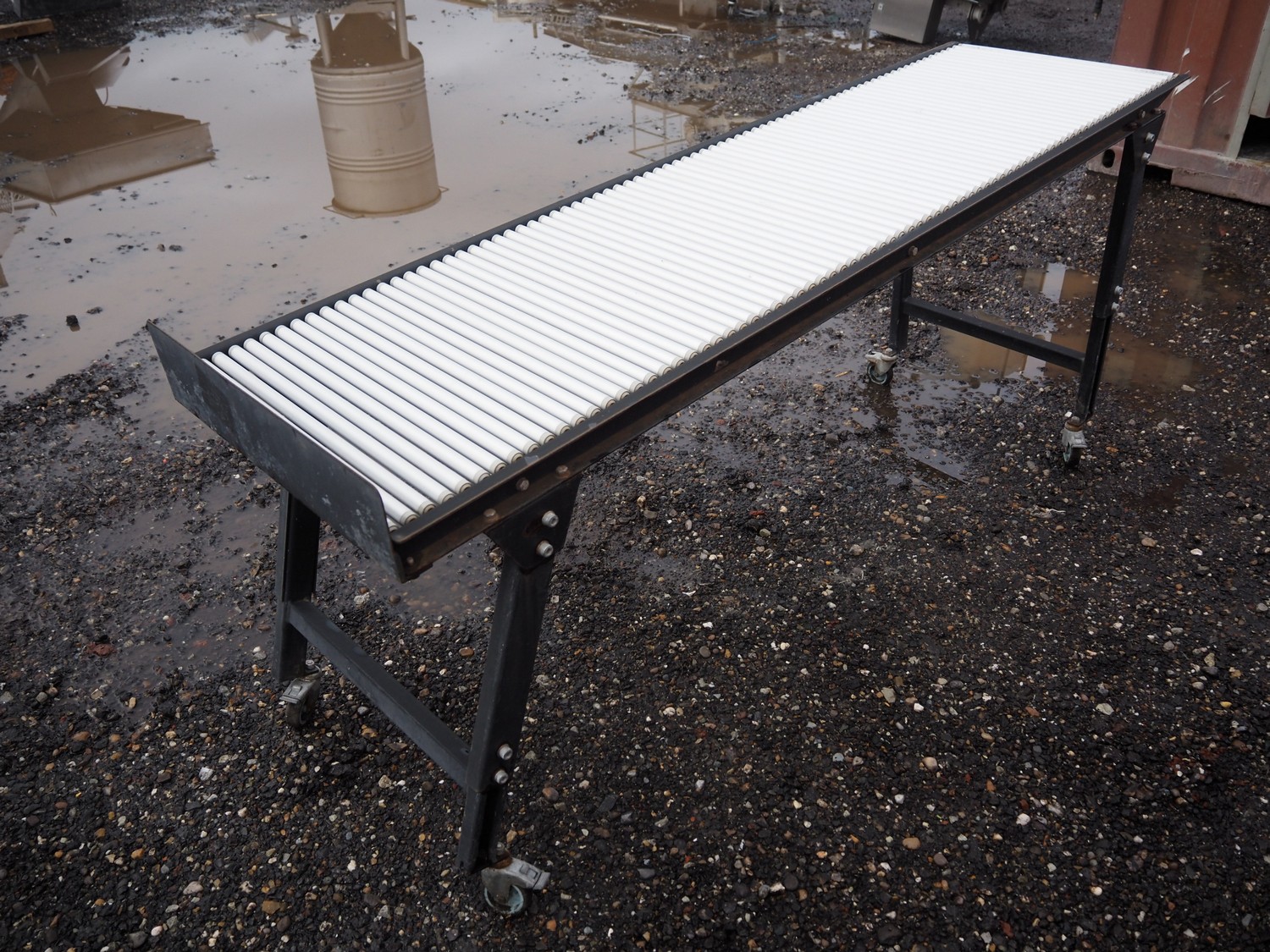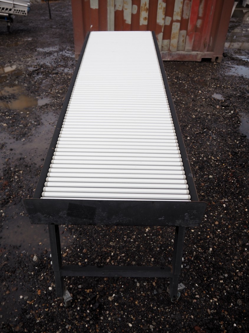 Mobile roller conveyor, steel frame, s/s rollers, roller width: 520 mm, total dimensions: 2000 mm x 580 mm x 770 mm.