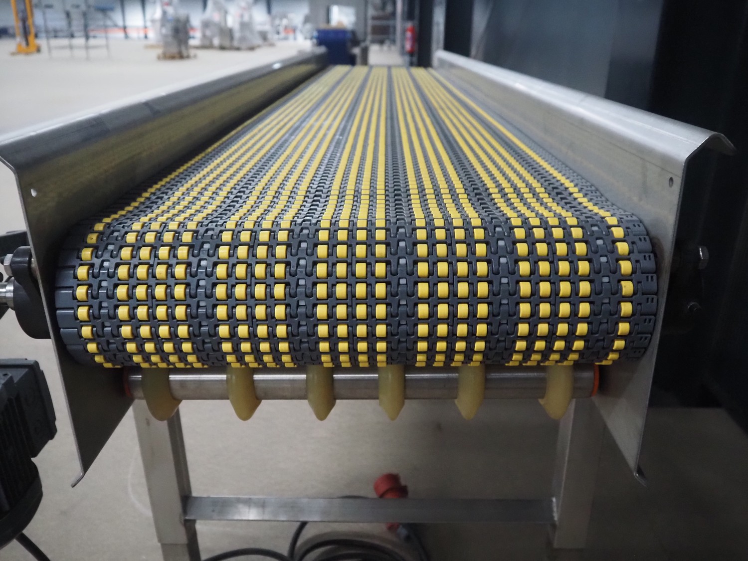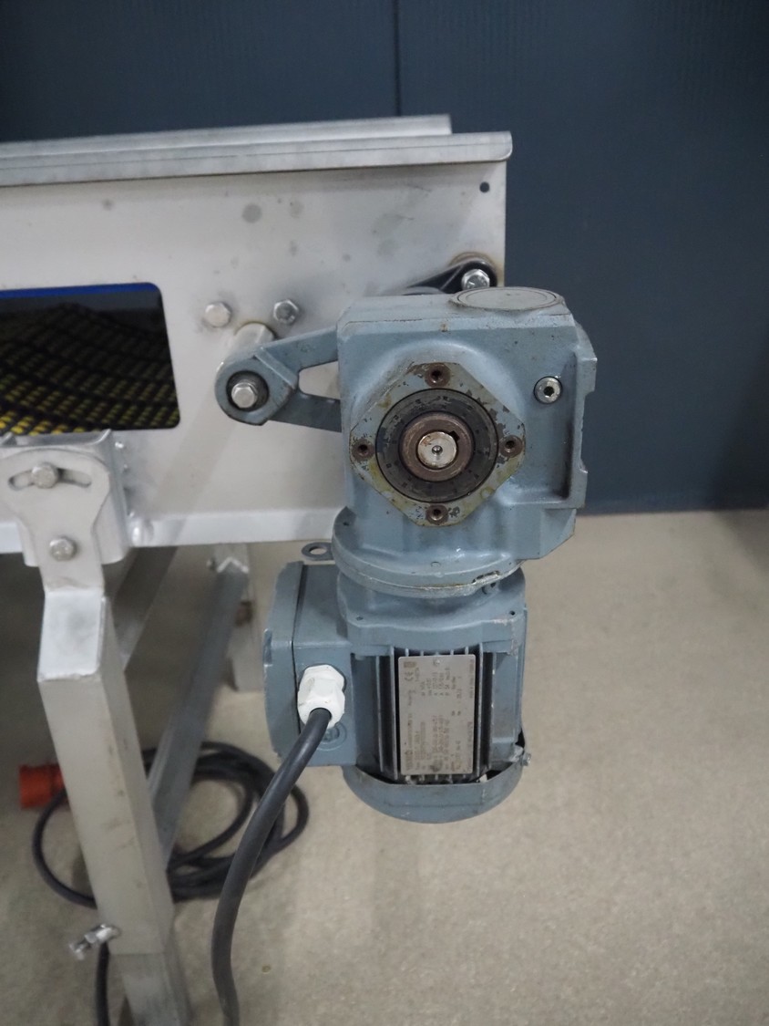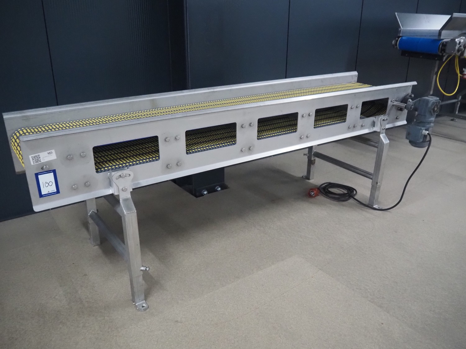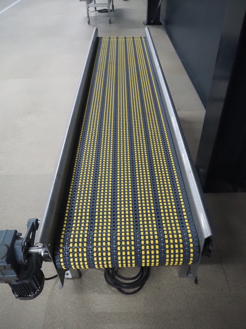 Transport belt, s/s frame, plastic belts with rollers, belt width: 450 mm, total dimensions: 2450 mm x 830 mm x 820 mm.