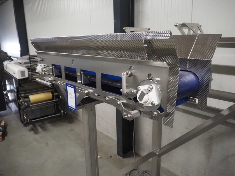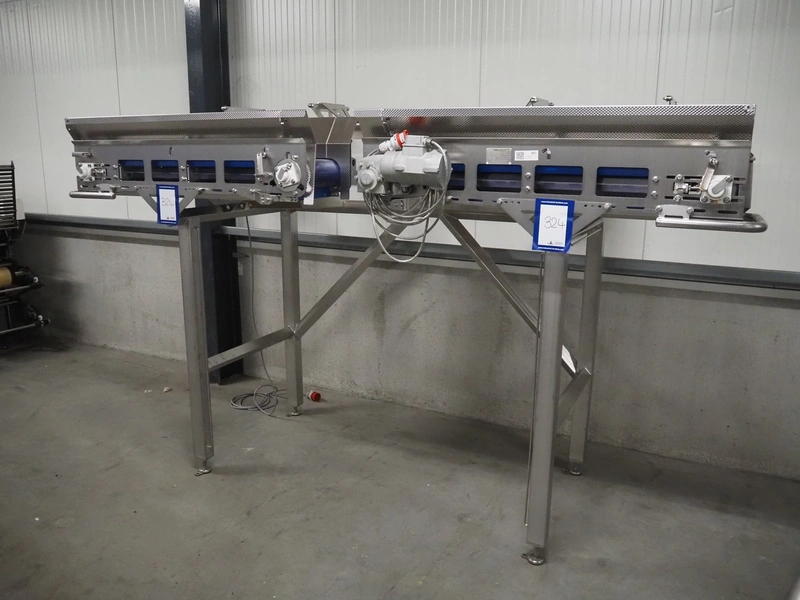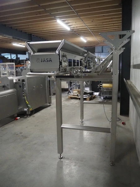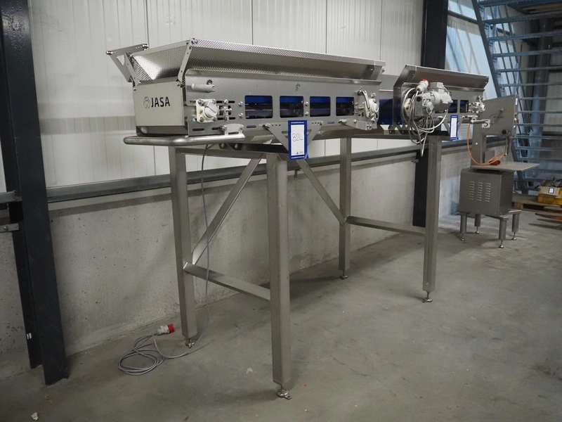Jasa Packaging Solutions double transport belt on s/s frame, model: 19100060300000, machine number: 14666, year of construction: 2019, 230 V, 3 Ph, 0.37 kW, 1.7 A, weight: 110 kg, belt width: (2x) 350 mm, belt length: (2x) 1400 mm, total dimensions: 3400 mm x 1450 mm x 2000 mm.