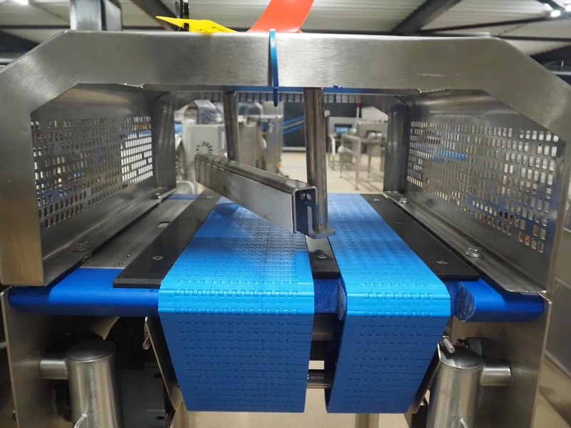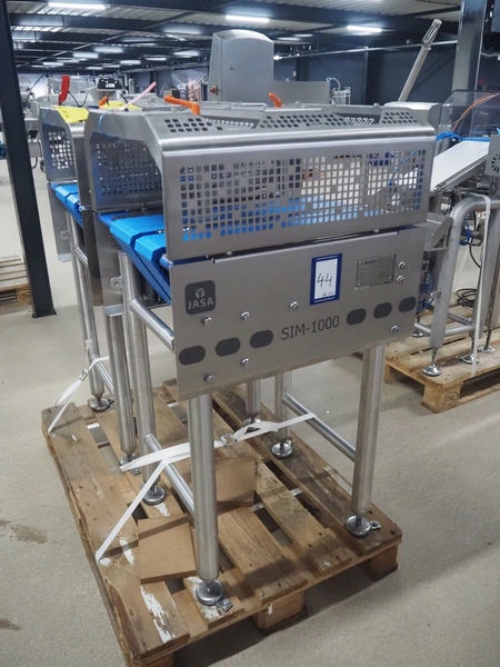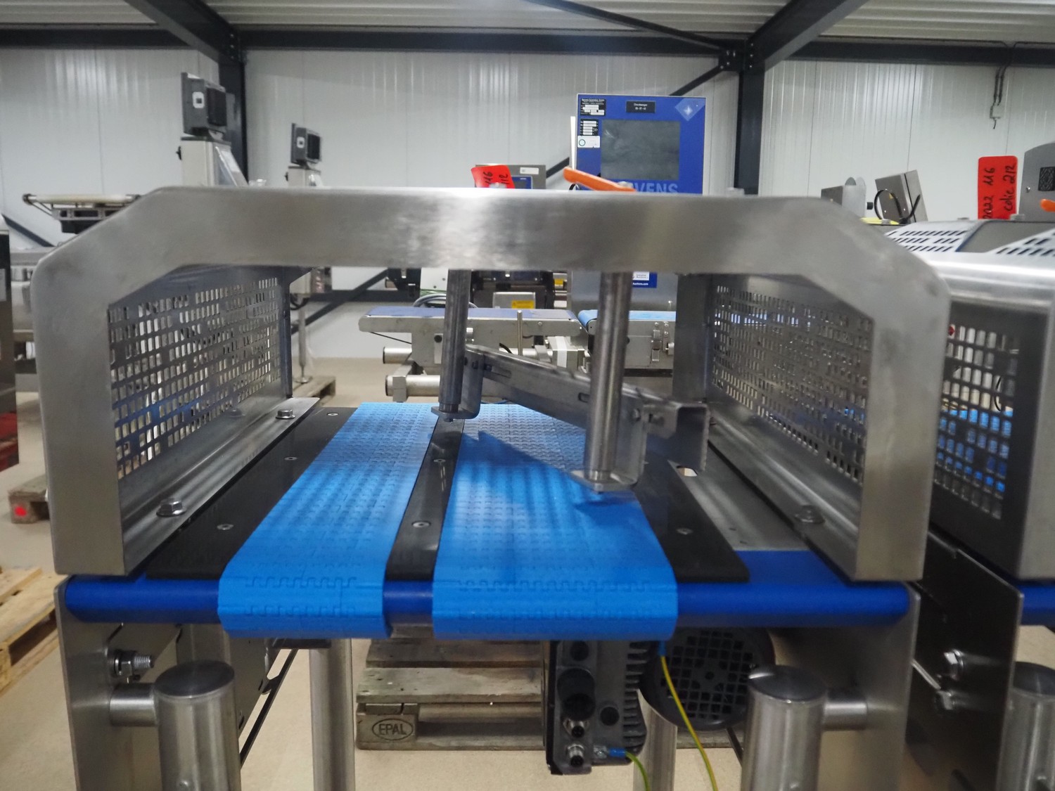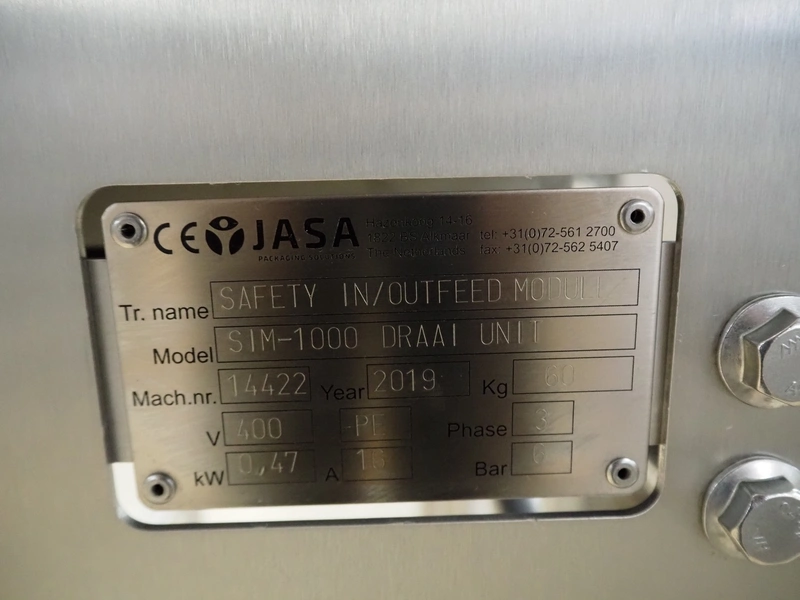 Jasa Packaging Solutions in/outfeed module, model: SIM-1000 DRAAI UNIT, machine number: 14422, year of construction: 2019, 400 V, 3 Ph, 16 A, 0.47 kW, 6 bar, plastic belts, belt width: (1x) 100 mm, (1x) 150 mm, total dimensions: 600 mm x 550 mm x 1550 mm.