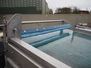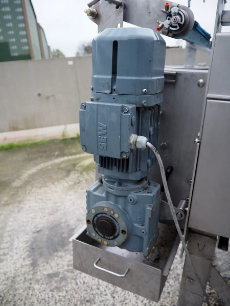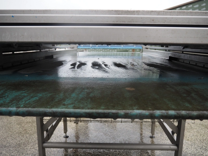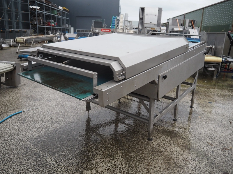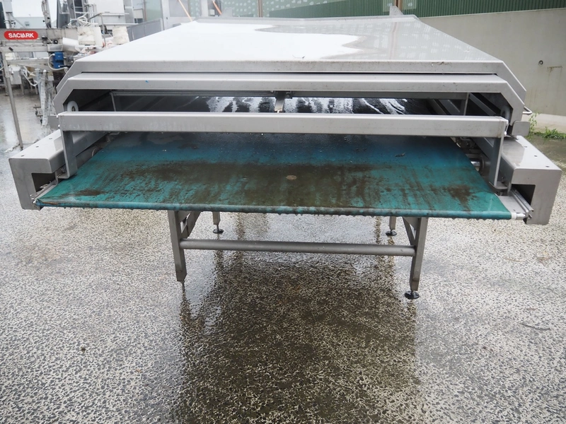 Transport belt, s/s frame and top cover, plastic belt, belt width: 1240 mm, total dimensions: 3450 mm x 1600 mm x 1670 mm.