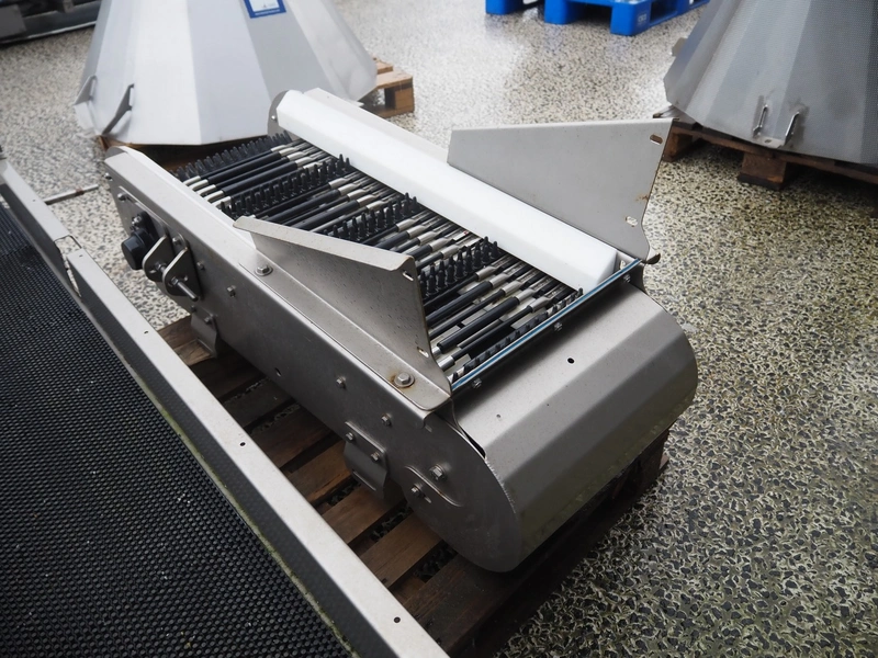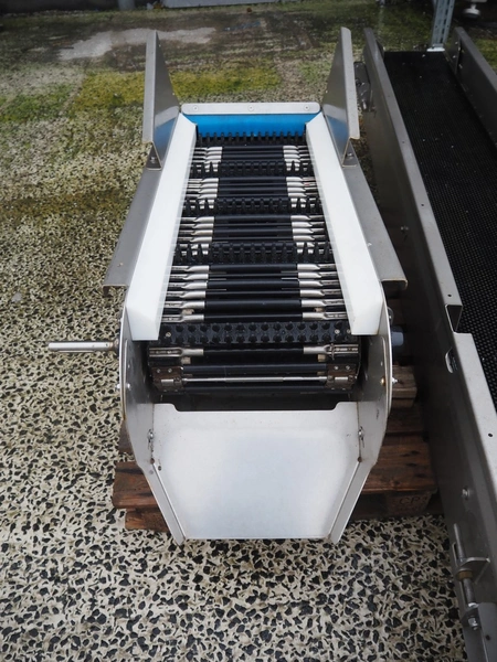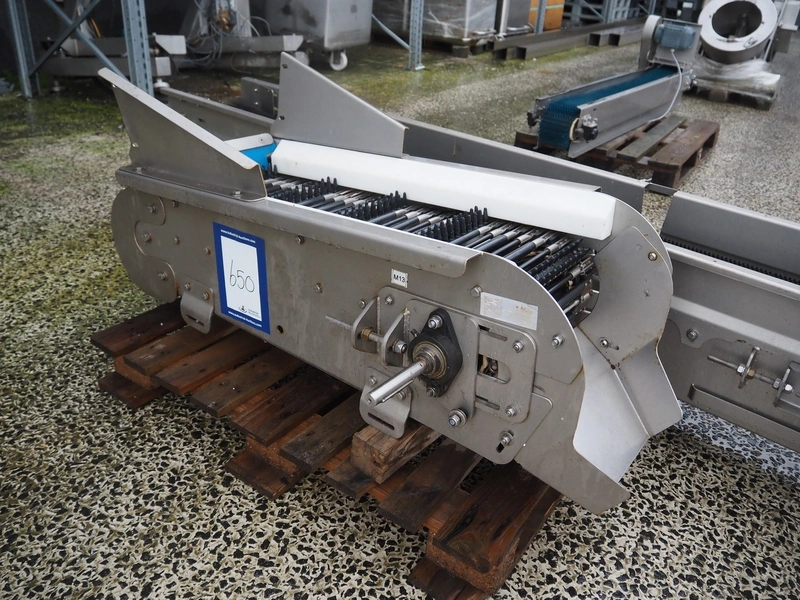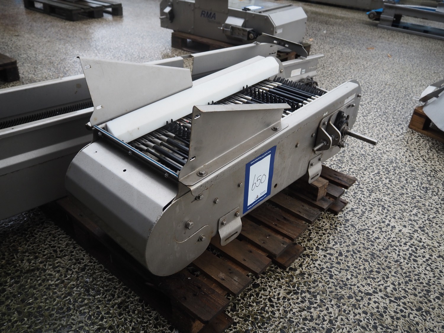 Transport belt, s/s frame, plastic chain conveyor, belt width: 350 mm, divider height: 30 mm, distance between dividers: 160 mm, total dimensions: 1140 mm x 500 mm x 600 mm. Missing motor.