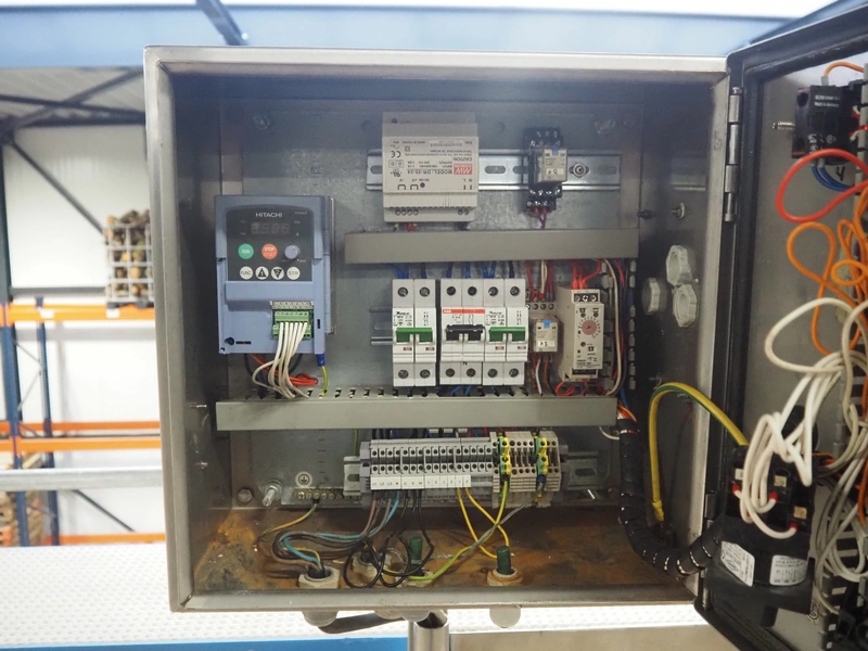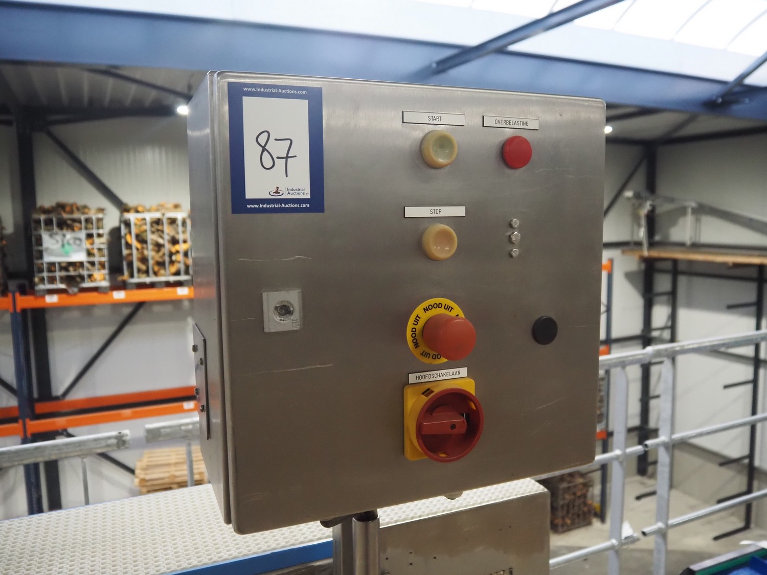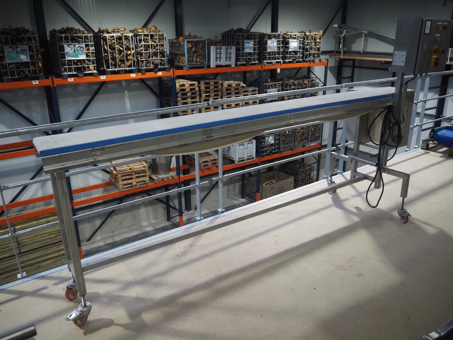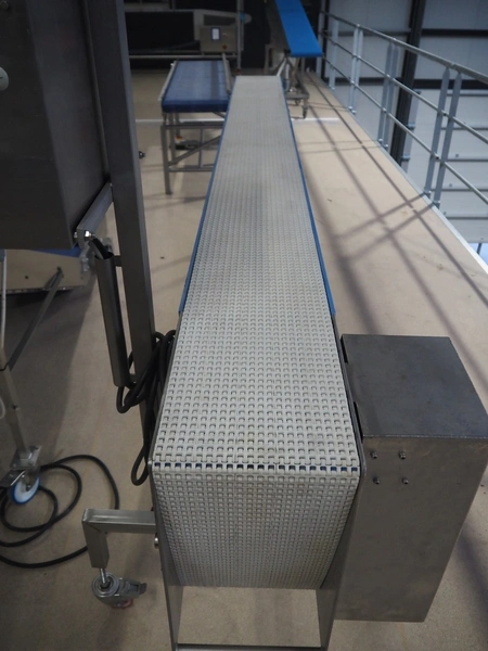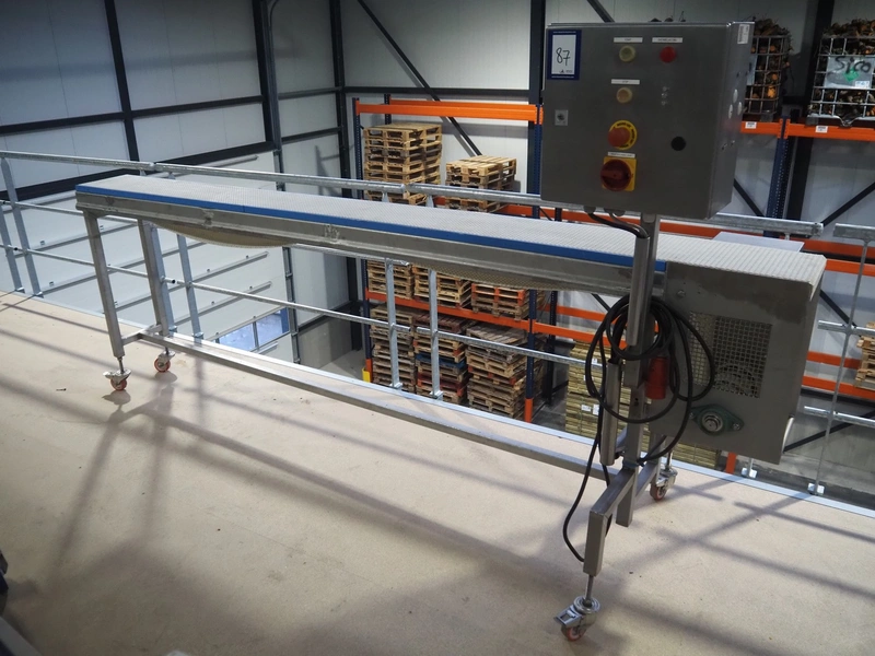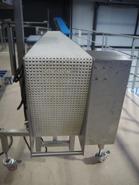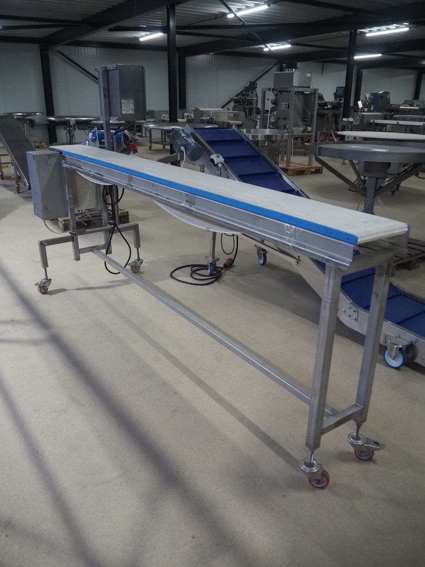 Mobile transport belt, s/s frame, plastic mesh belt, belt width: 255 mm, total dimensions: 3050 mm x 800 mm x 1600 mm.