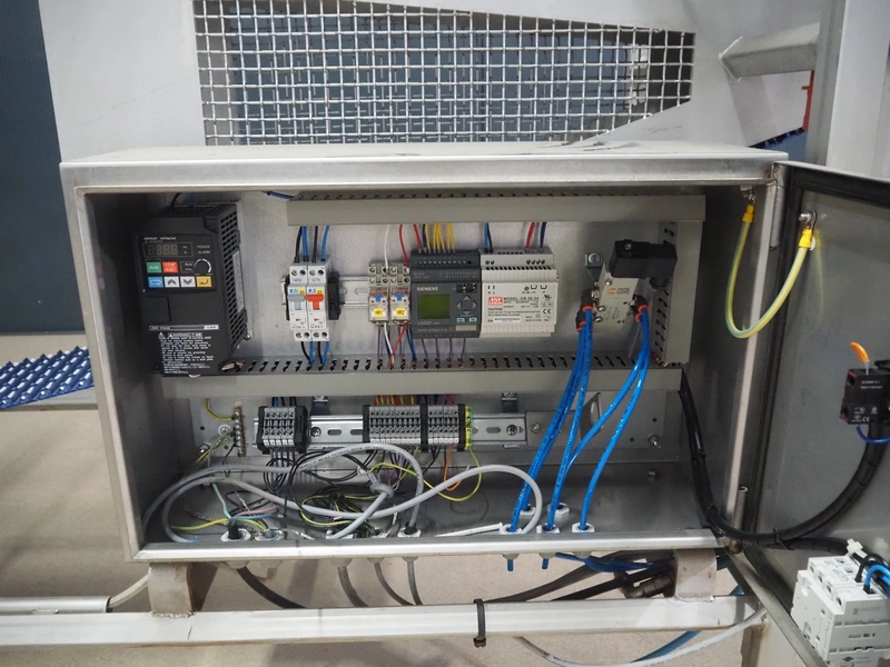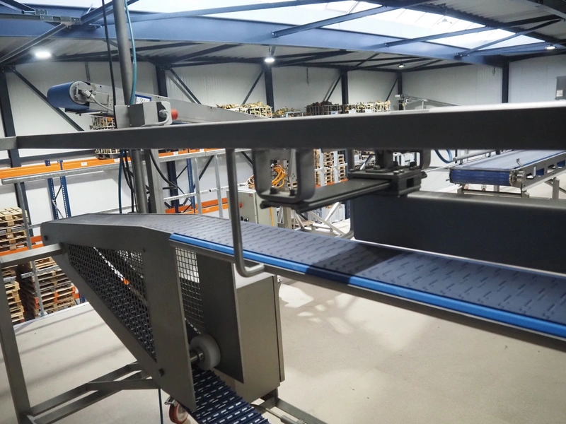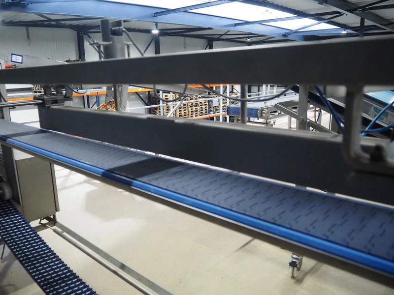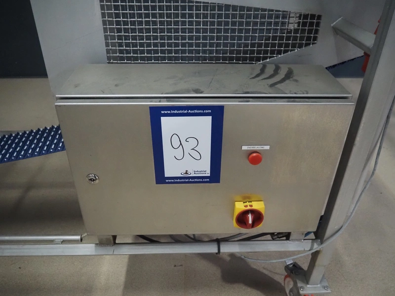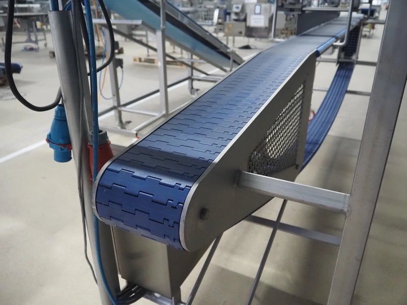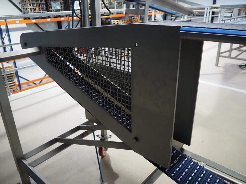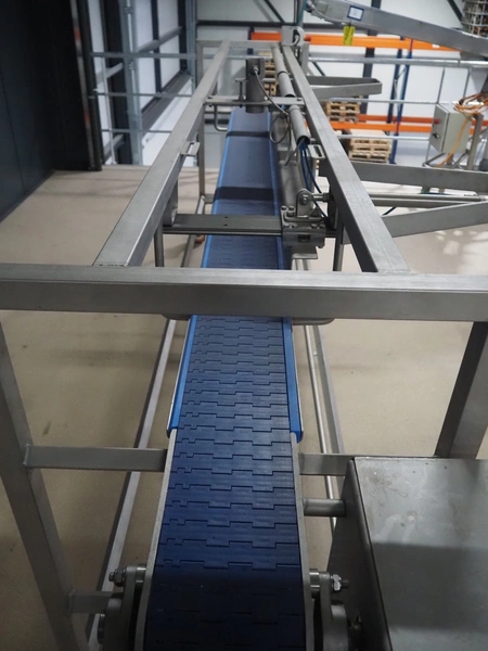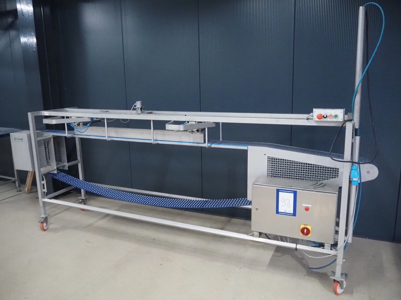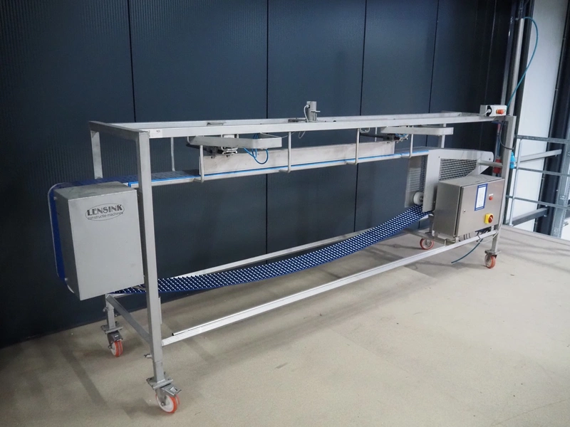 Lensink mobile transport belt with rejector, s/s frame, plastic belt, belt width: 153 mm, total dimensions: 3400 mm x 850 mm x 2000 mm.