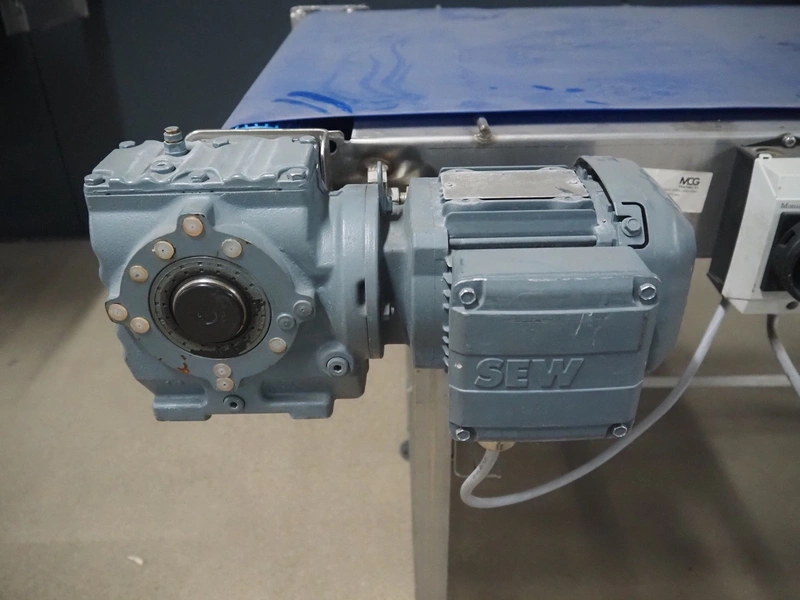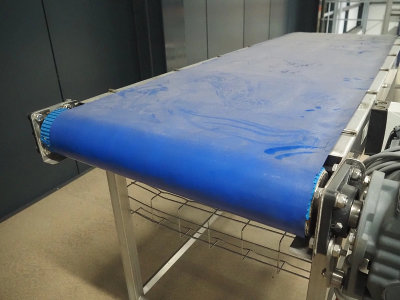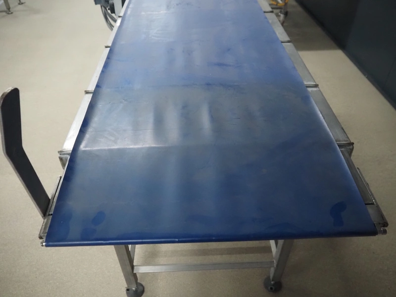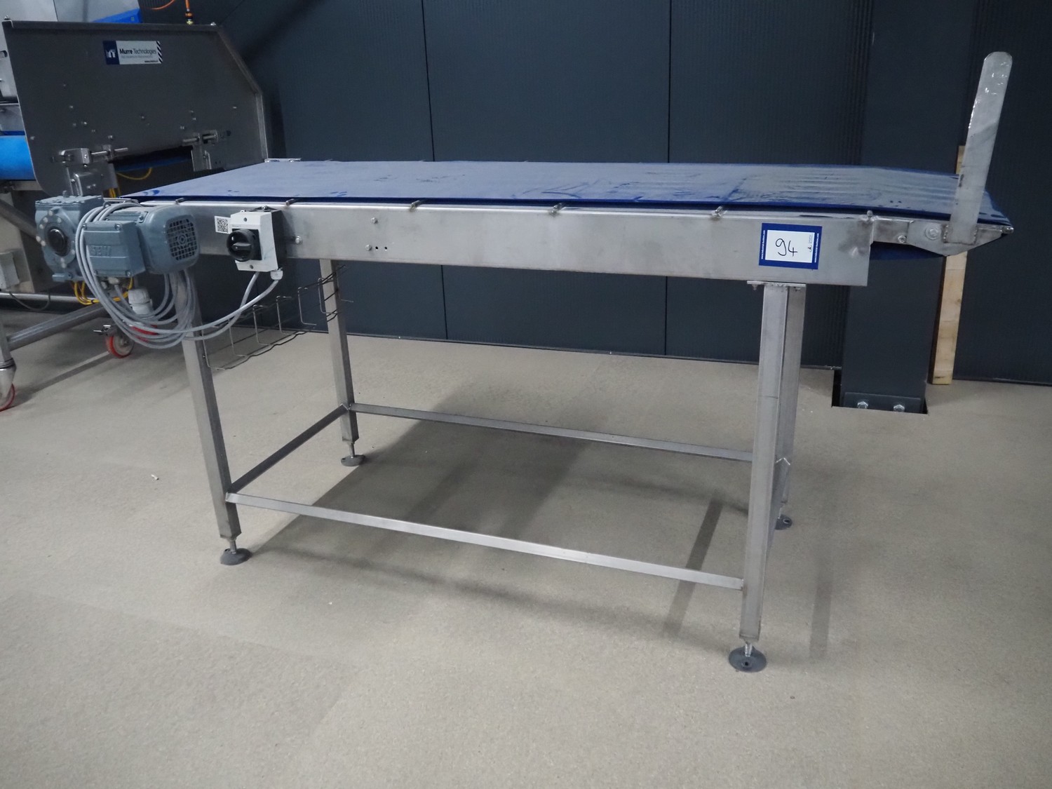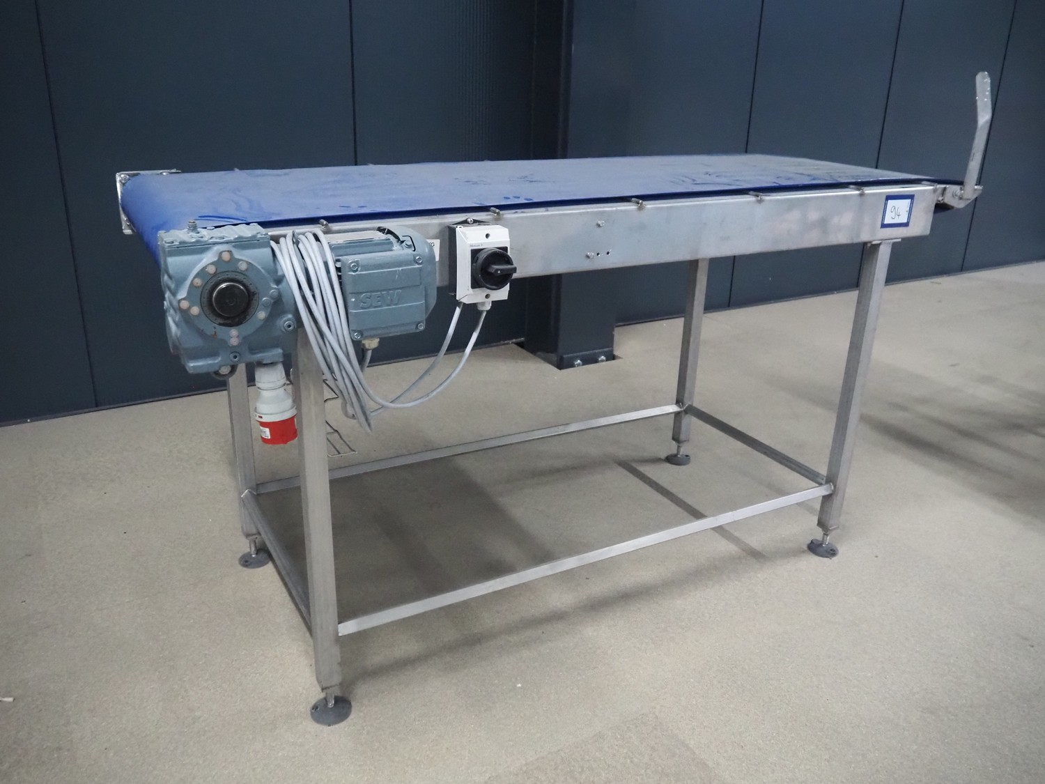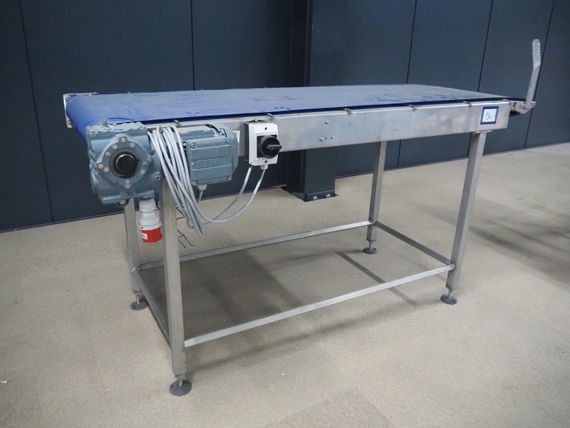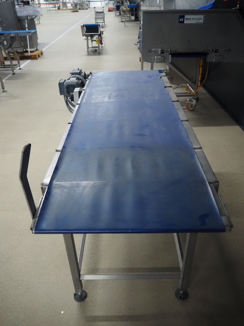 Transport belt, s/s frame, plastic belt, belt width: 570 mm, total dimensions: 2000 mm x 1000 mm x 1000 mm.