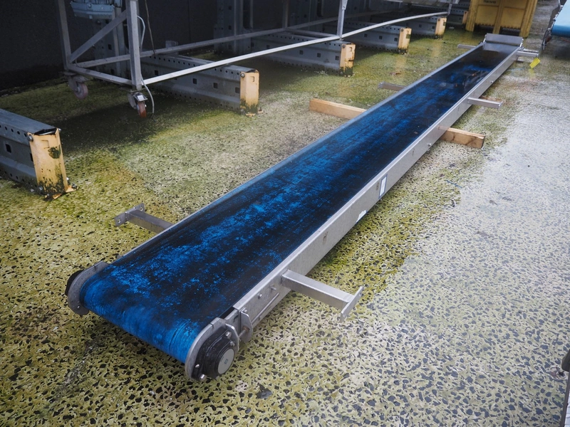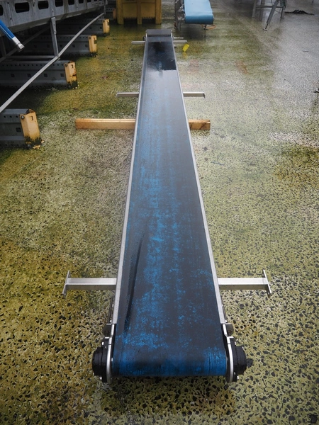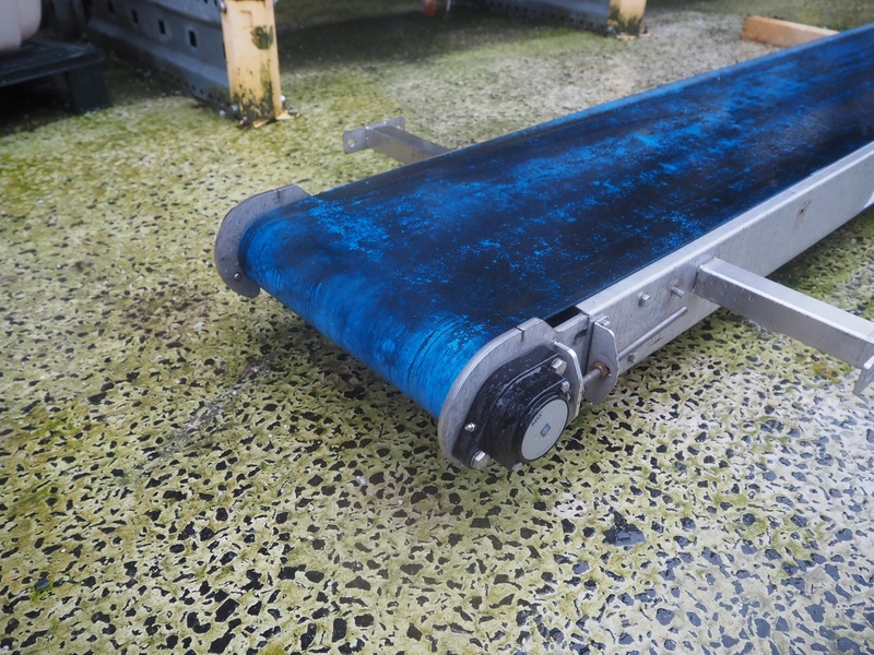 Transport belt, s/s frame, plastic belt, belt width: 400 mm, total dimensions: 6150 mm x 900 mm x 300 mm.