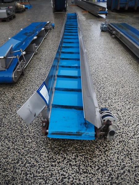 Elevating belt, s/s frame, plastic belt with dividers, belt width: 400 mm, divider height: 40 mm, distance between dividers: 320 mm, total dimensions: 7100 mm x 750 mm x 500 mm.