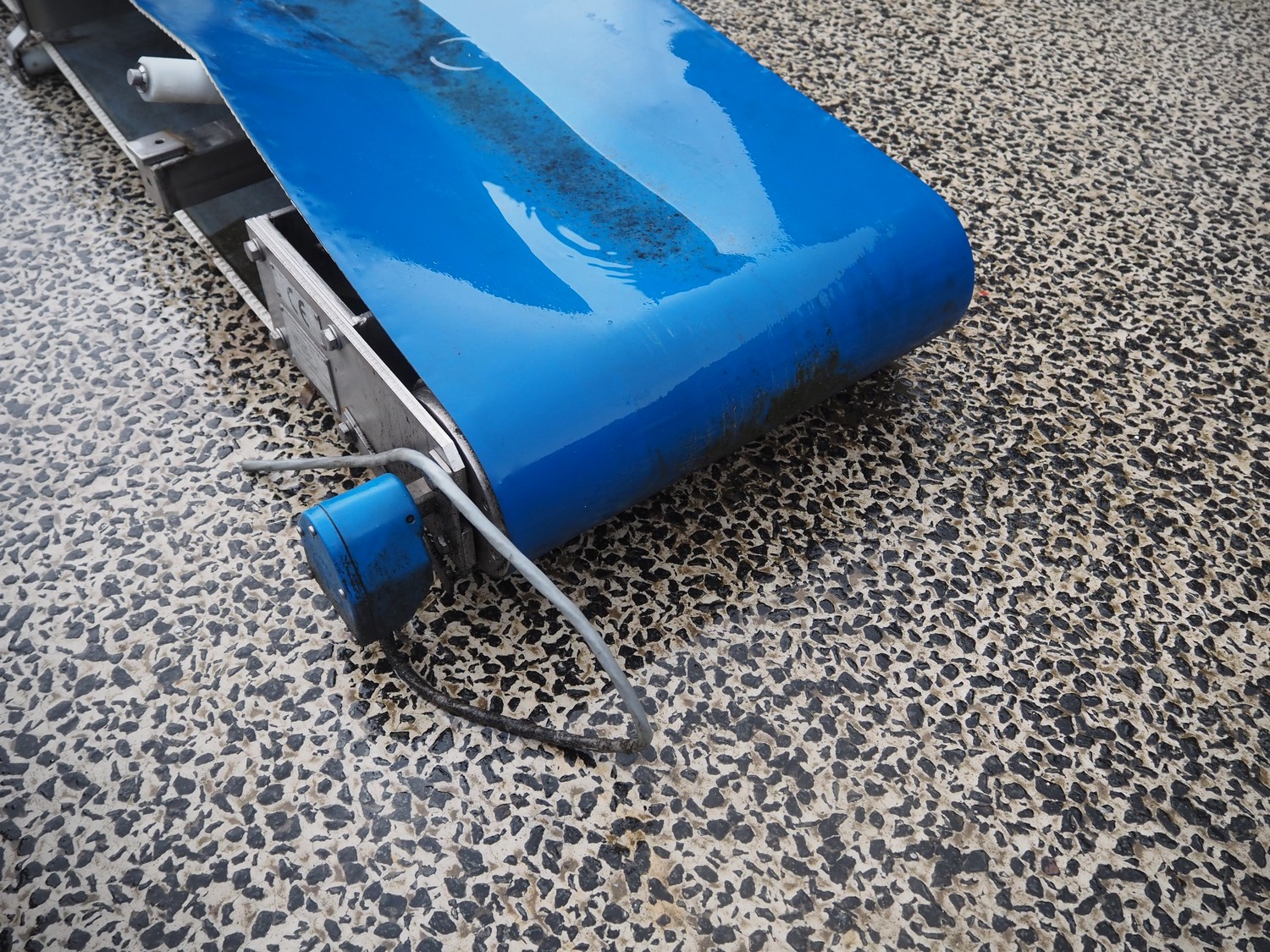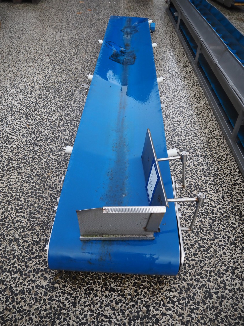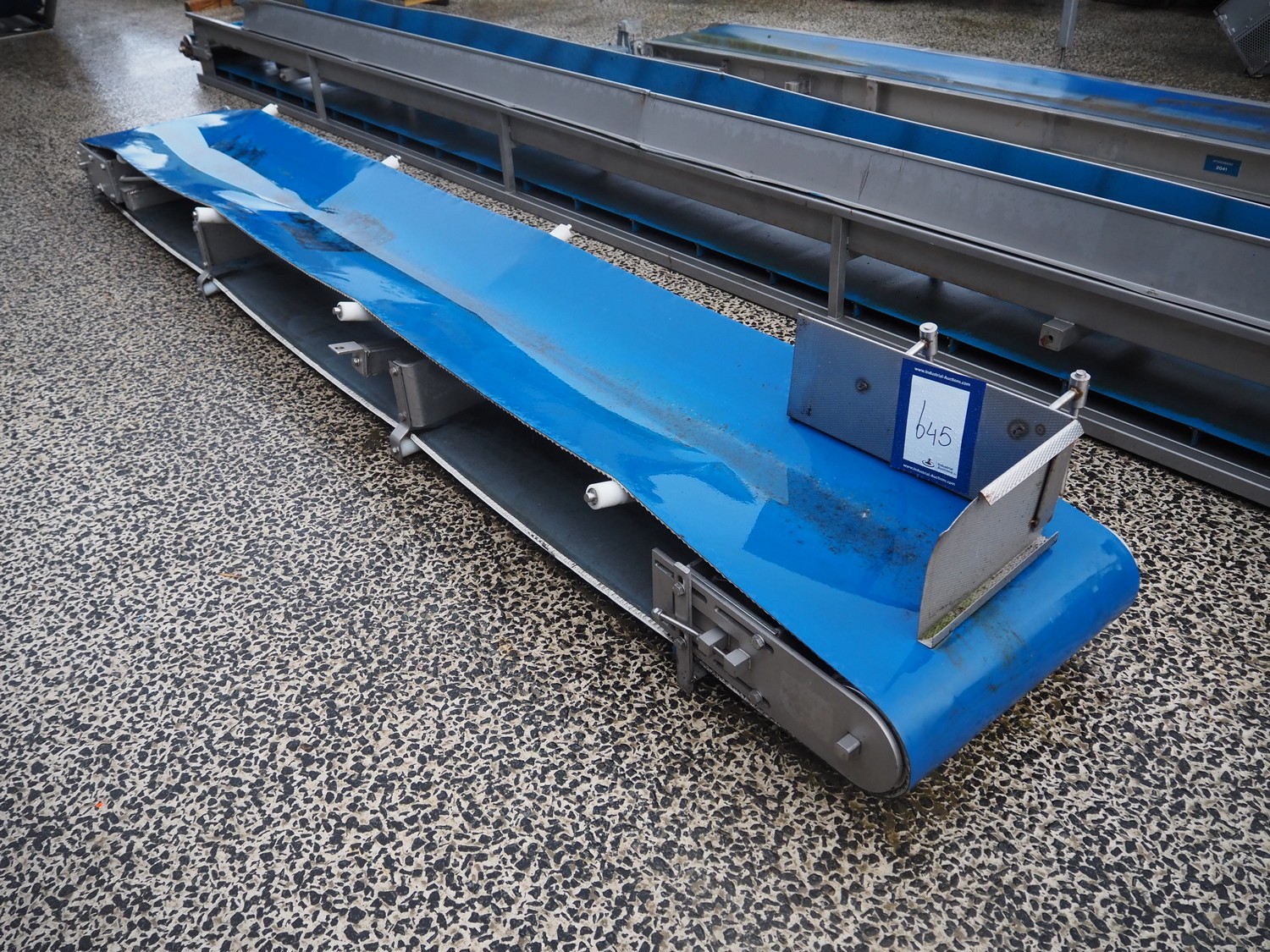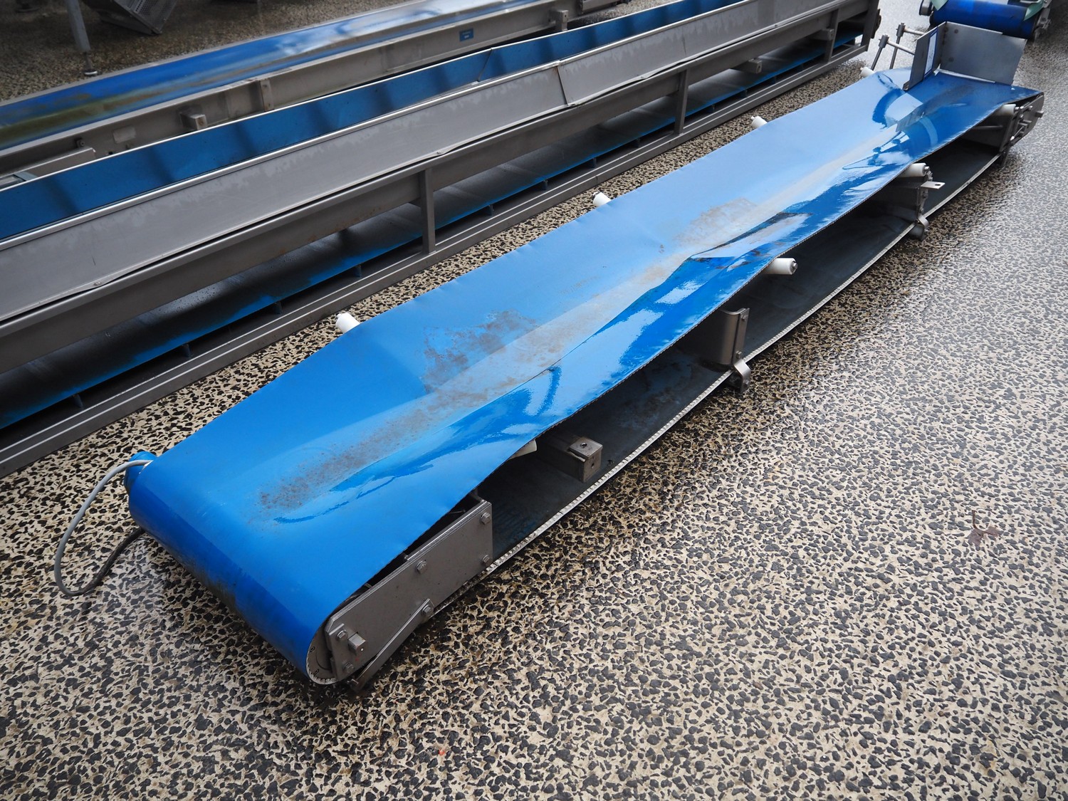 Transport belt, s/s frame, type: Transportband Trogvorm, machine number: 00106, year of construction: 2002, plastic belt, belt width: 550 mm, total dimensions: 4000 mm x 700 mm x 450 mm.