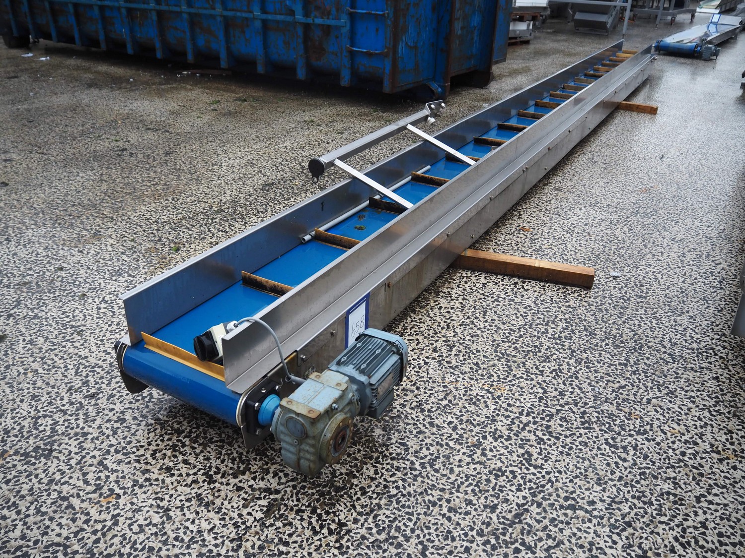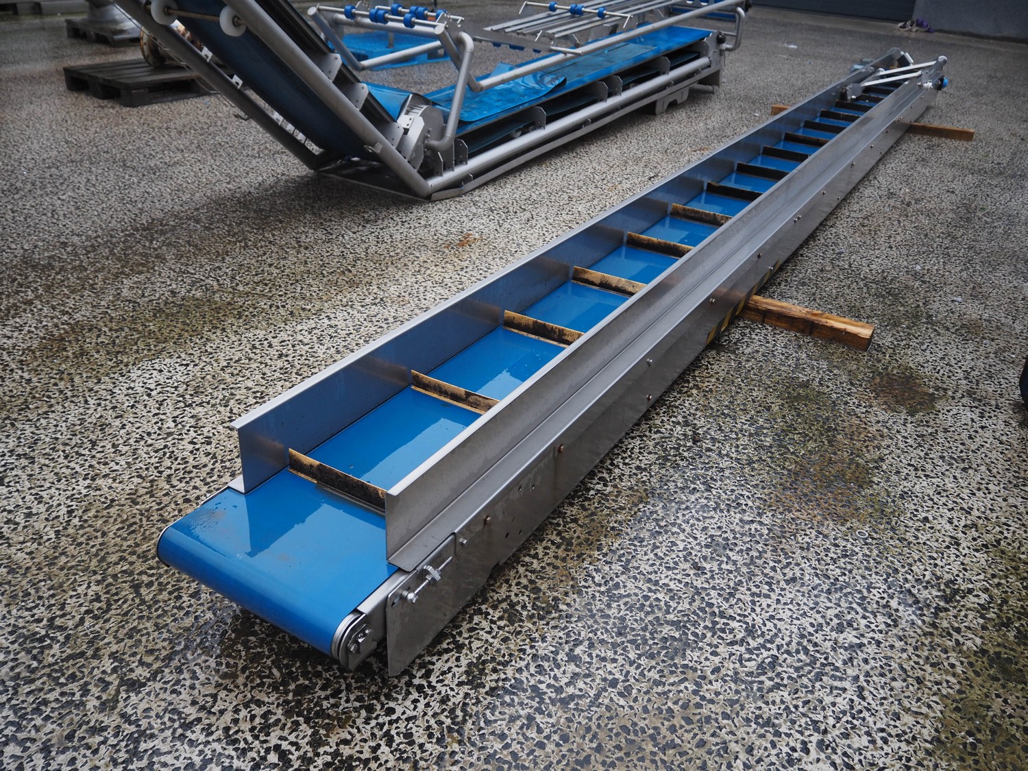 Transport belt with dividers, plastic belt, belt width: 400 mm, distance between dividers: 400 mm, divider height: 50 mm, total dimensions: 7600 mm x 750 mm x 380 mm.