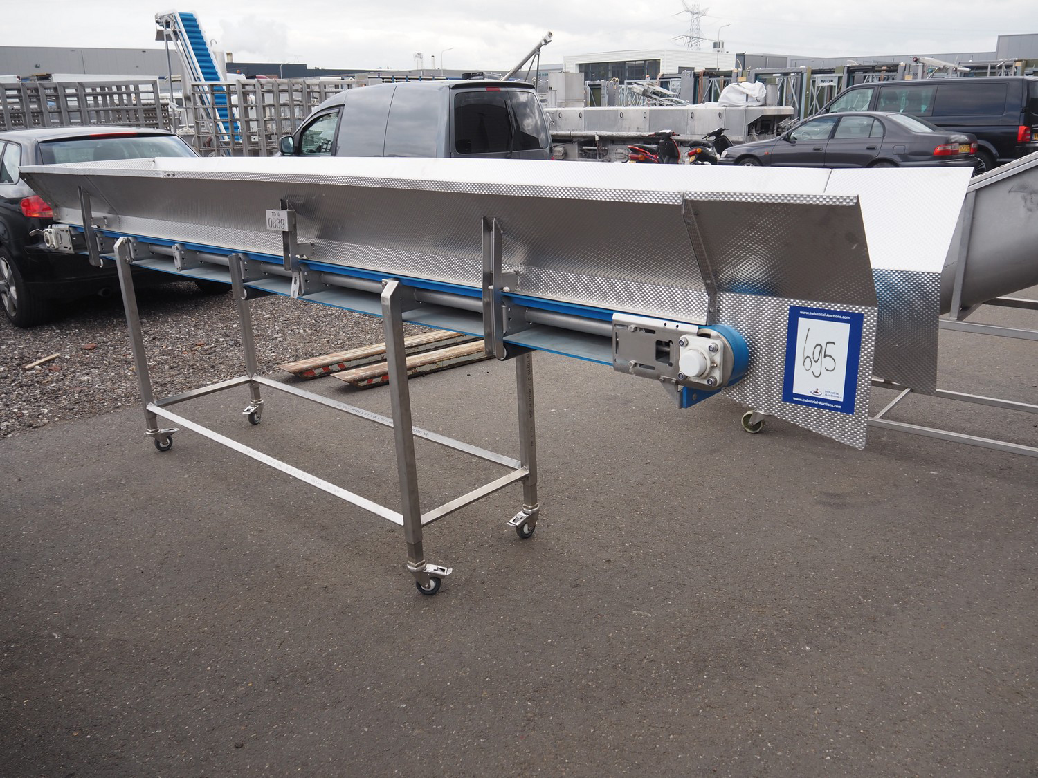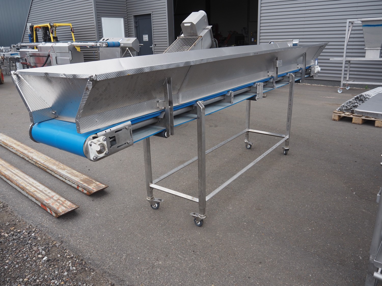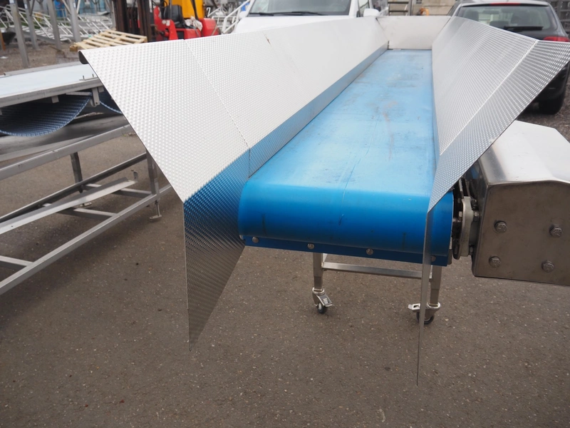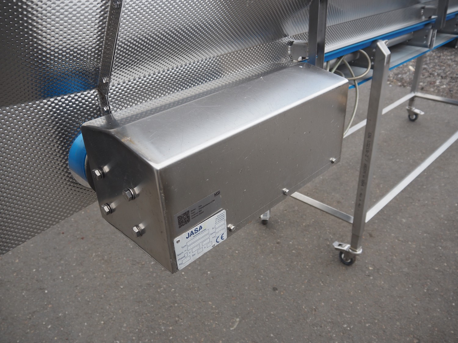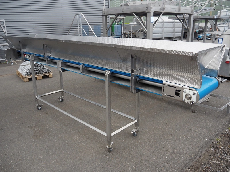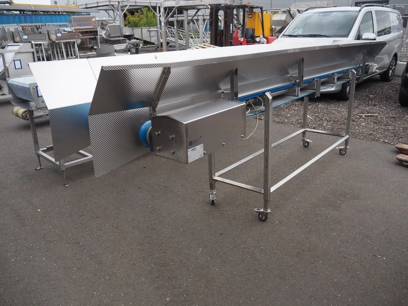 Jasa mobile transport belt, type: Aanvoerband, machine number: 12700, year of construction: 2016, 230 V, 1 Ph, 0.75 kW, s/s frame, plastic belt, belt width: 420 mm, total dimensions: 4100 mm x 750 mm x 1300 mm.