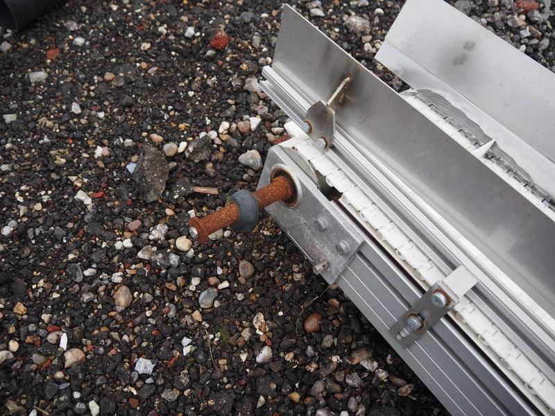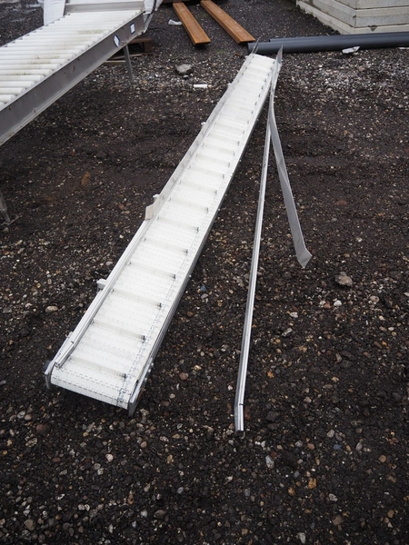 Transport belt, aluminium frame, plastic belt with dividers, belt width: 260 mm, total dimensions: 3300 mm x 400 mm x 250 mm.