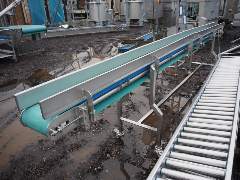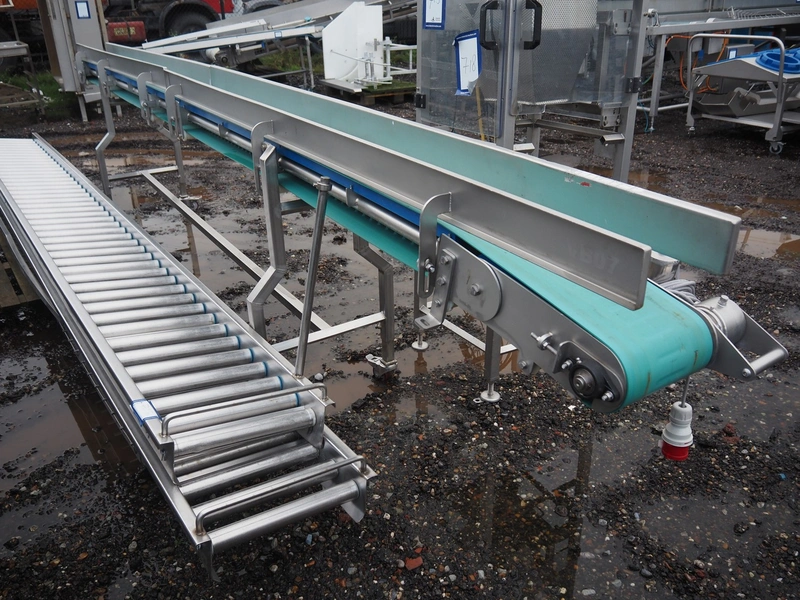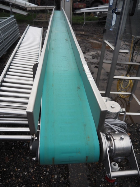 Mobile transport belt, s/s frame, plastic belt, belt width: 230 mm, total dimensions: 5200 mm x 600 mm x 1100 mm.