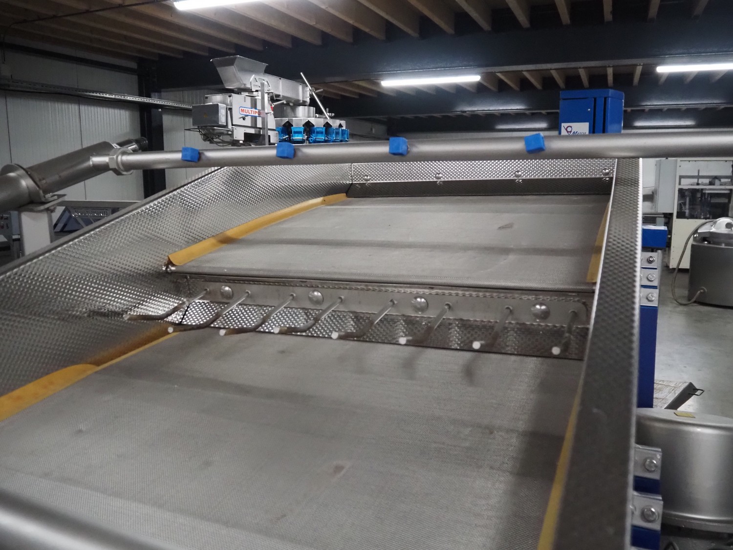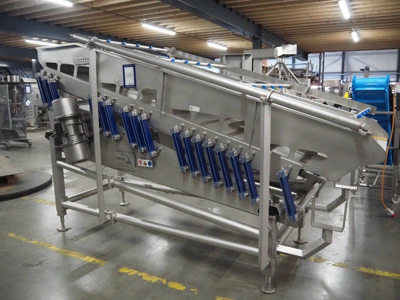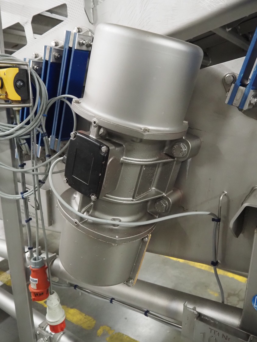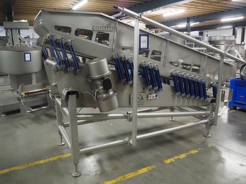Foodeq s/s vibrating gutter with sieve, type: TTR800/3200, number: 17194, year of construction: 2018, gutter width: 800 mm, sieve: 1 mm, total dimensions: 3200 mm x 1400 mm x 2050 mm.