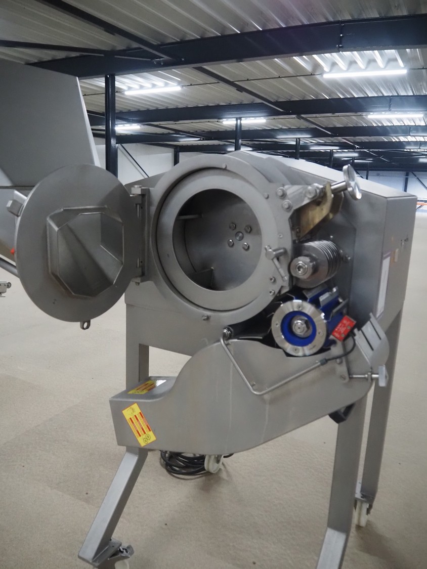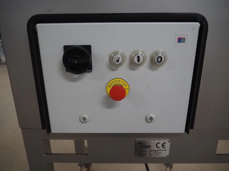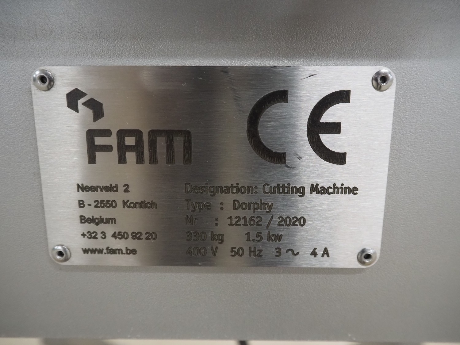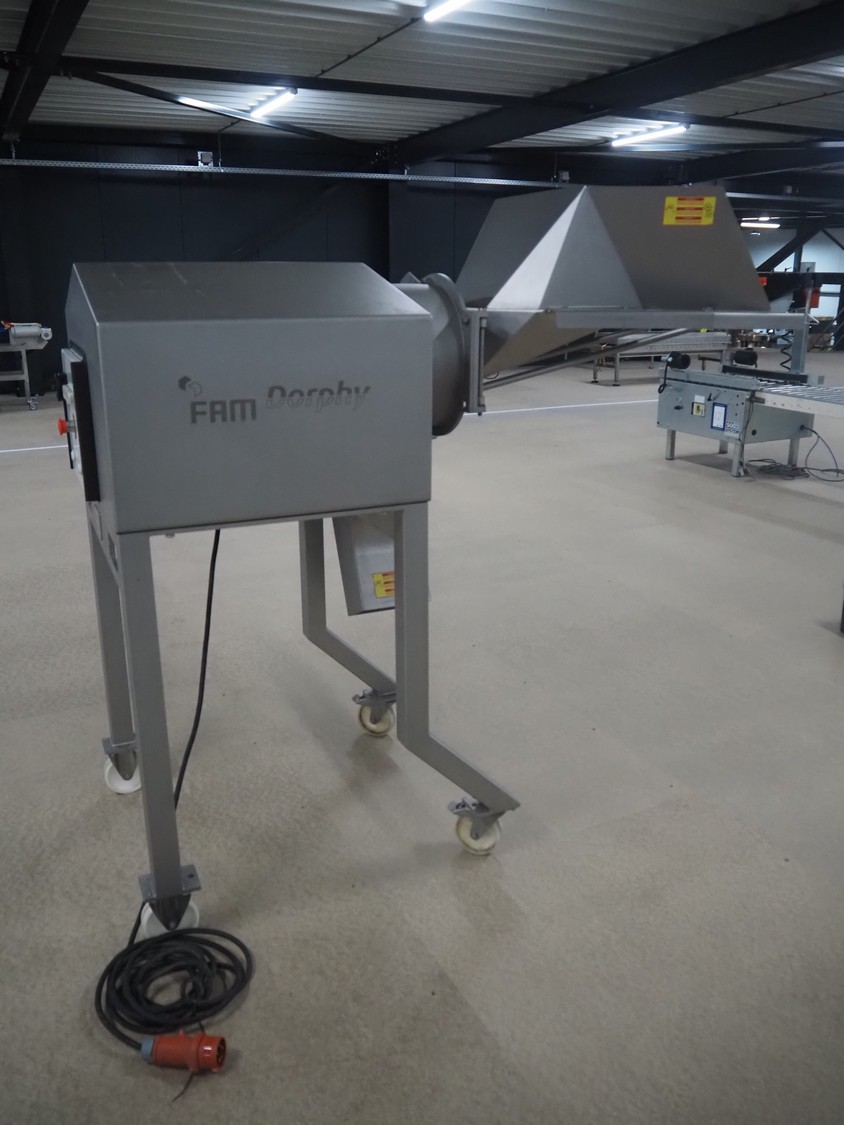 FAM mobile vegetable dicer, type: Dorphy, number: 12162, year of construction: 2020, 400 V, 3 Ph, 50 Hz, 4 A, 1.5 kW, working width: 120 mm, distance between knives: 15 mm, total dimensions: 1770 mm x 800 mm x 1650 mm. Including toolbox.