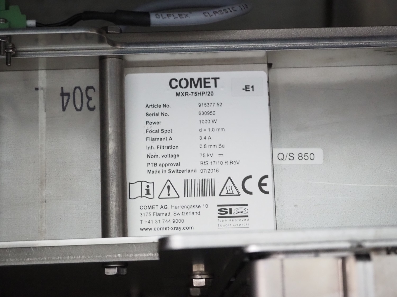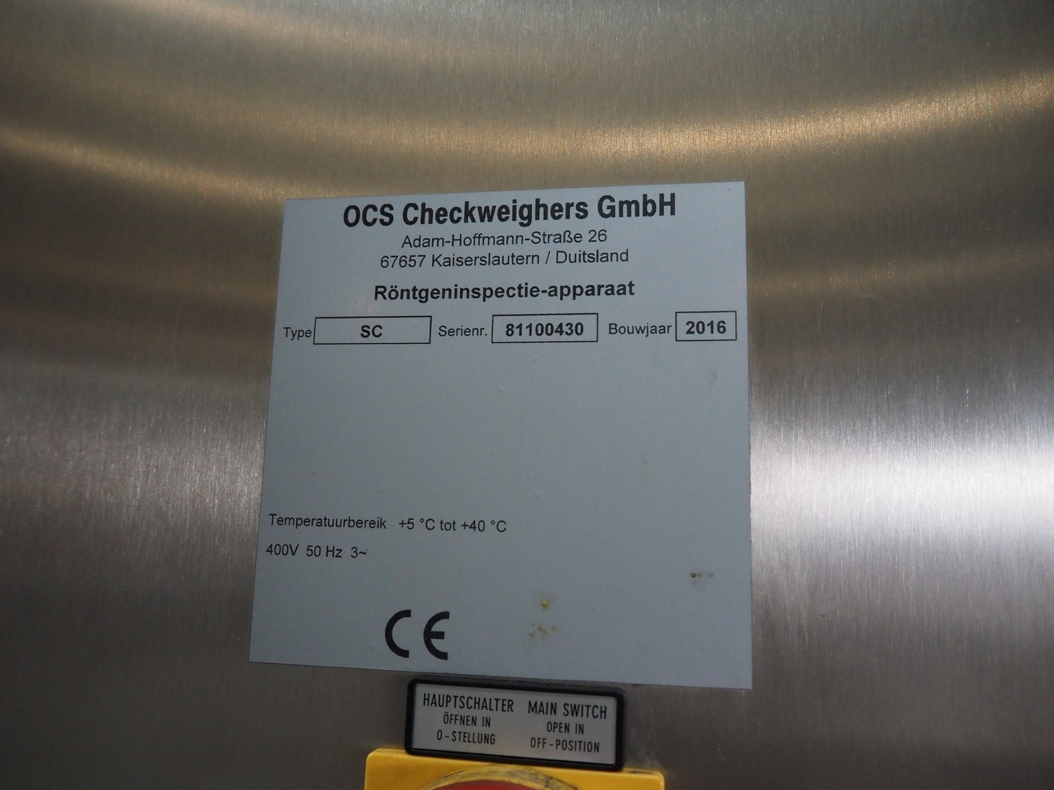 - OCS x-ray scanner, type: SC, serial number: 81100430, year of construction: 2016, plastic belt, belt width: 610 mm, clearance: 570 mm x 280 mm, total dimensions: 1660 mm x 1250 mm x 2400 mm,