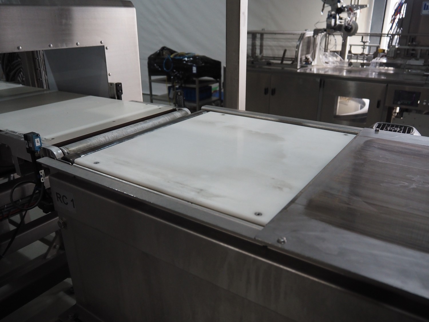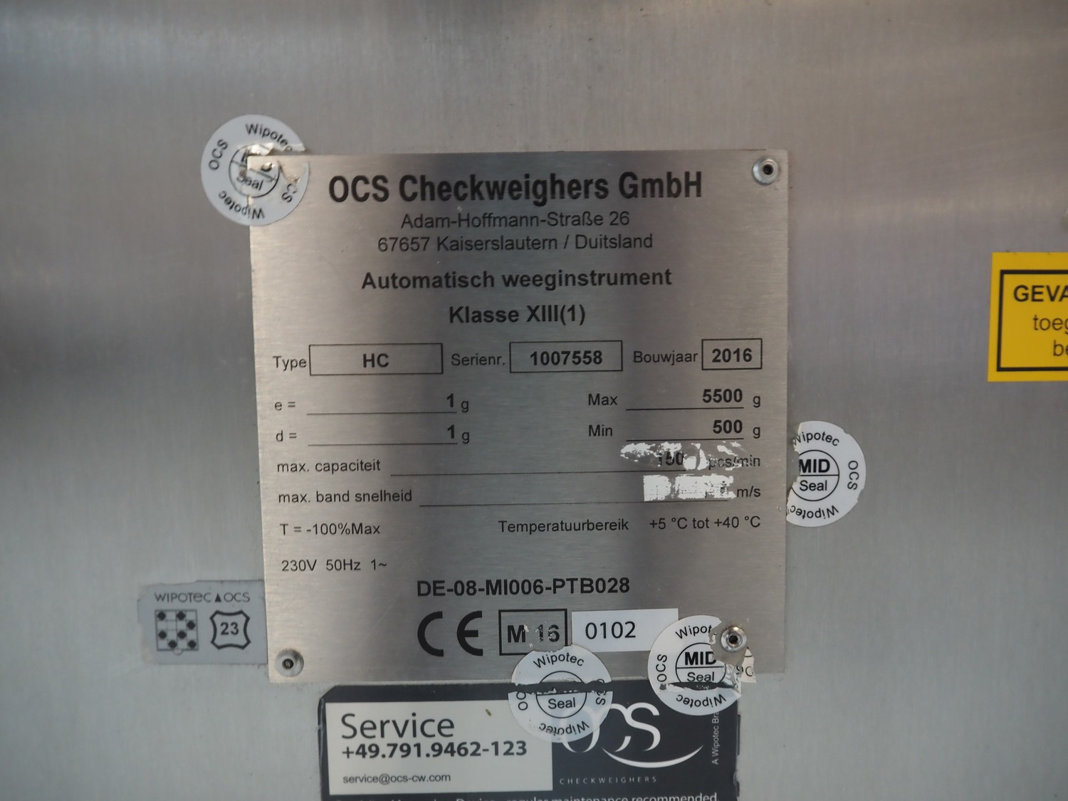 - OCS checkweigher, type: HC, serial number: 1007558, year of construction: 2016, min: 500 gram, max: 550 gram, belt width: 410 mm, Eia metal detector with 2 rejectors, belt width: 410, clearance: 500 mm x 170 mm, total dimensions: 4000 mm x 1200 mm x 2180 mm,