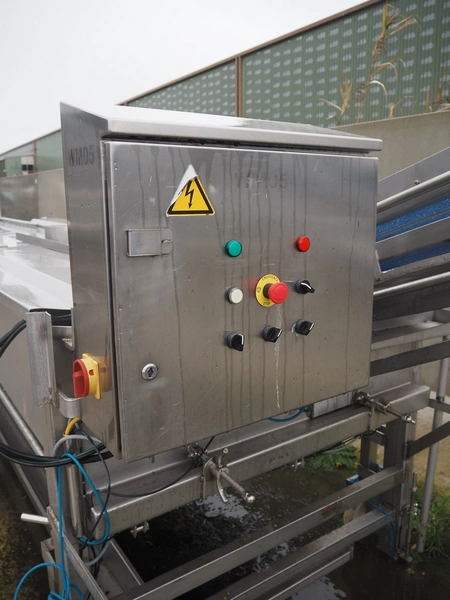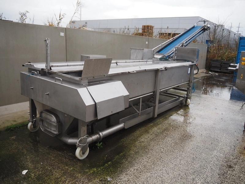 Mobile vegetable washing tub with dryer and outfeed belt, plastic sieve belt, belt width: 380 mm, inside dimensions: 4000 mm x 1250 mm x 650 mm, total dimensions: 8000 mm x 1900 mm x 2750 mm.