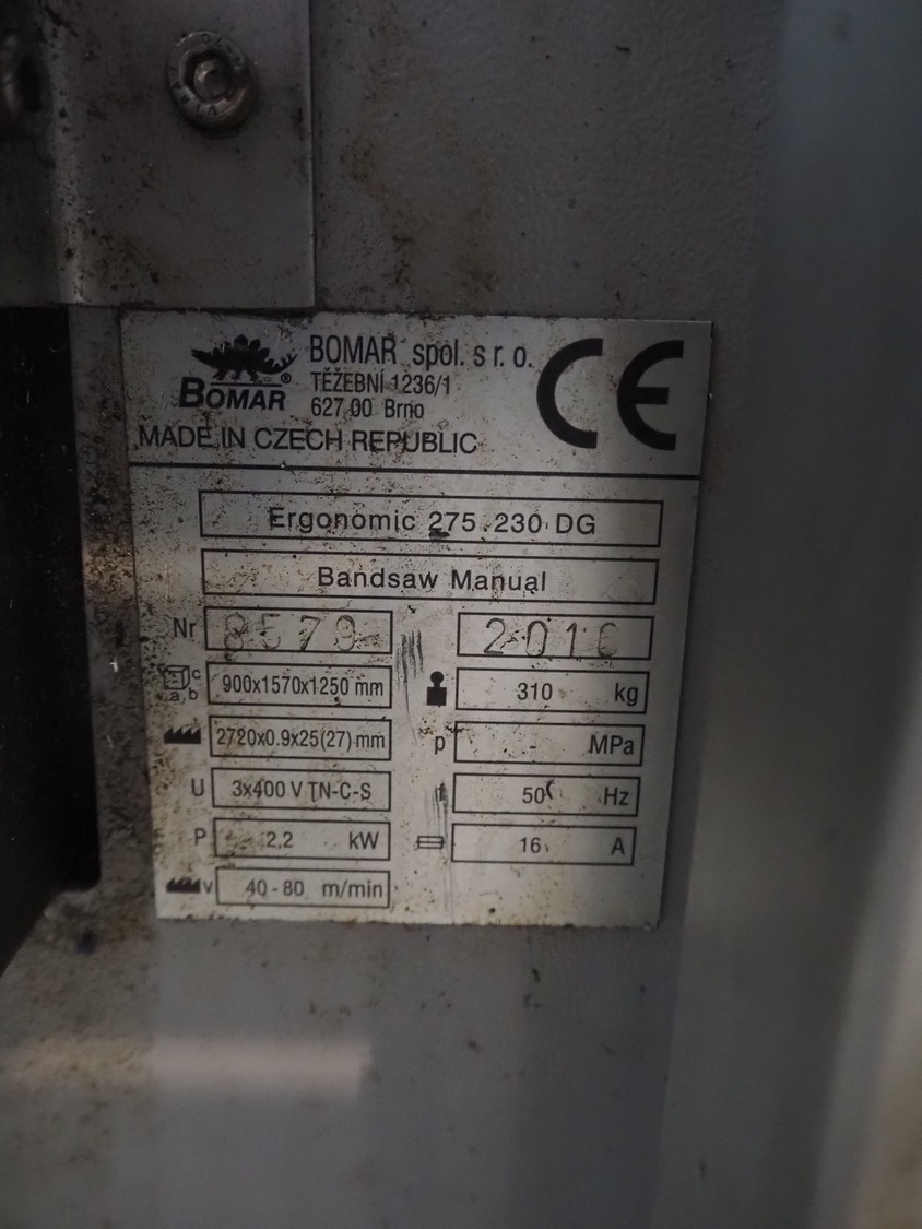 Bomar spol s.r.o. metal saw, type: Ergonomic 275 230 DG, number: 8570, year of construction: 2010, 400 V, 3 Ph, 50 Hz, 16 A, 2.2 kW, weight: 310 kg, dimensions: 1500 mm x 2200 mm x 1300 mm.