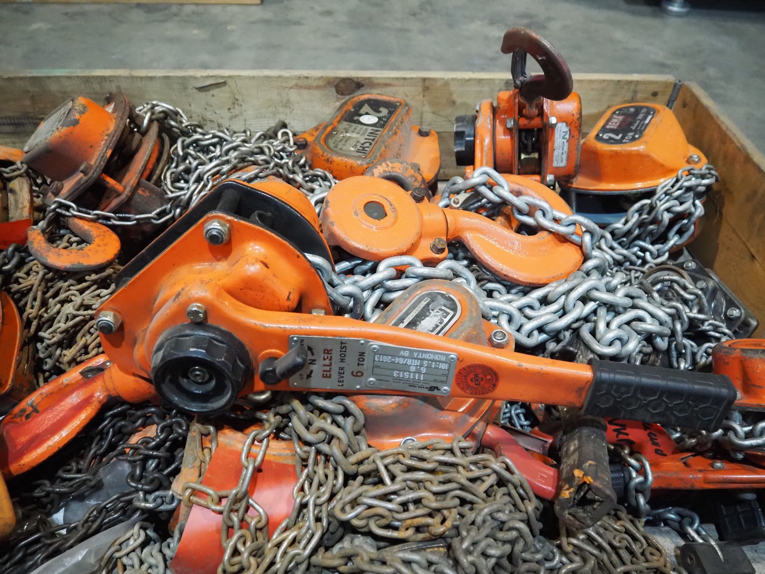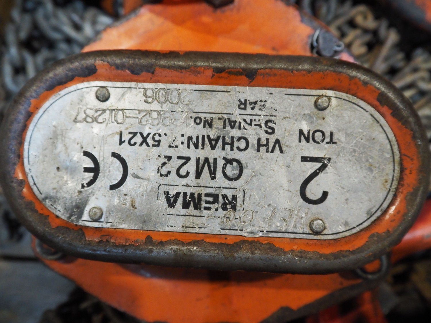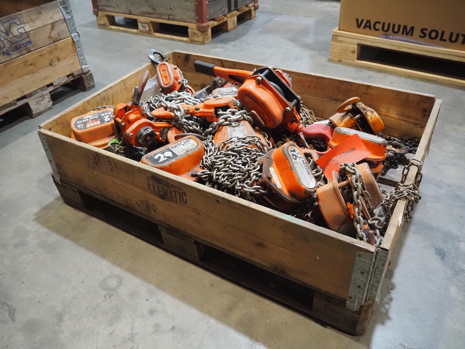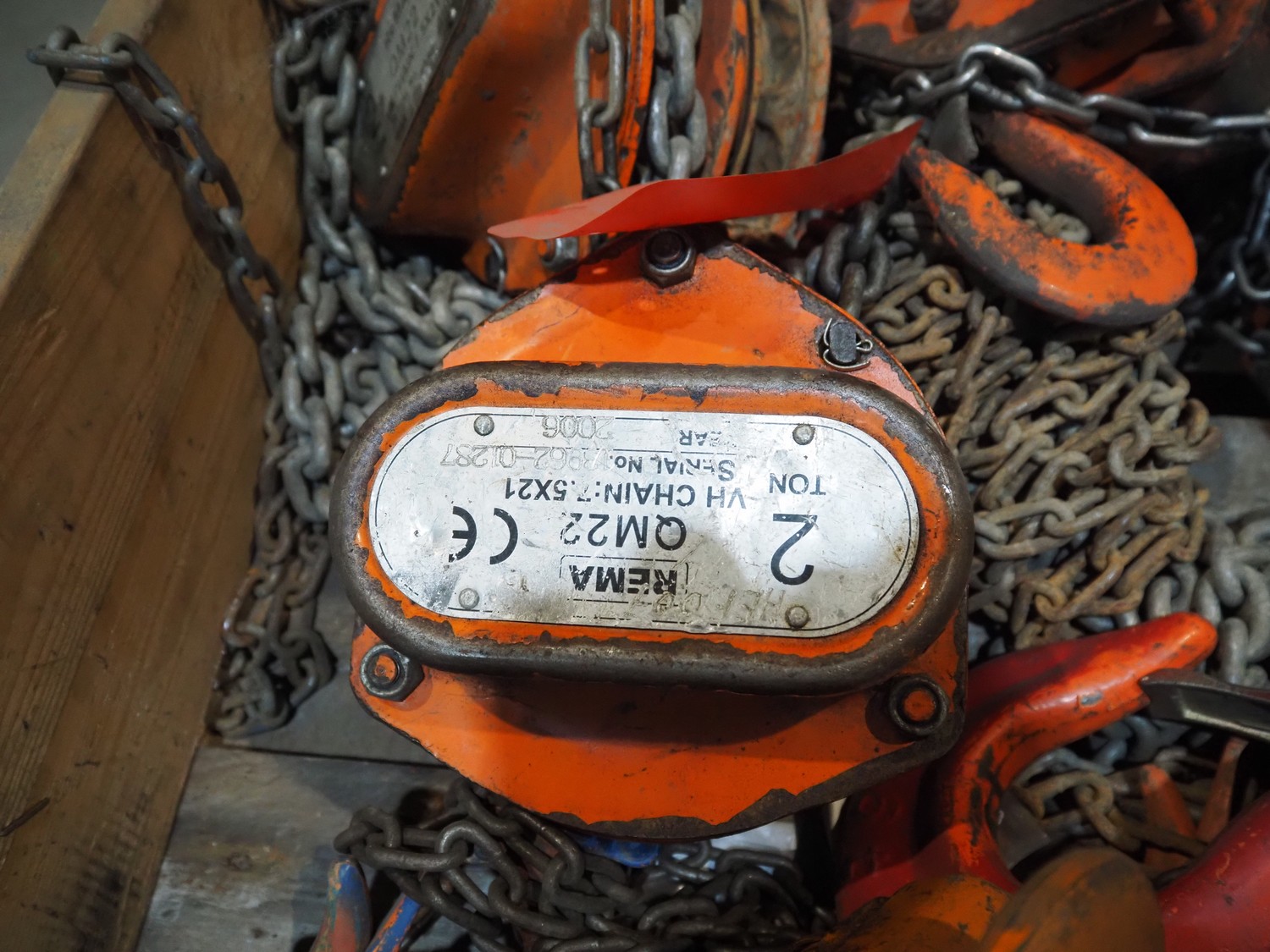 Pallet with 11 Rema hoists, capacity: (1x) 1 ton, (3x) 1.5 ton, (1x) 1.6 ton, (5x) 2 ton and (1x) 6 ton, dimensions: 1200 mm x 800 mm x 400 mm.