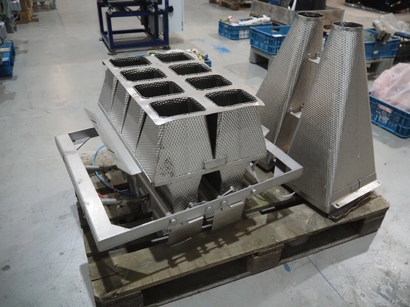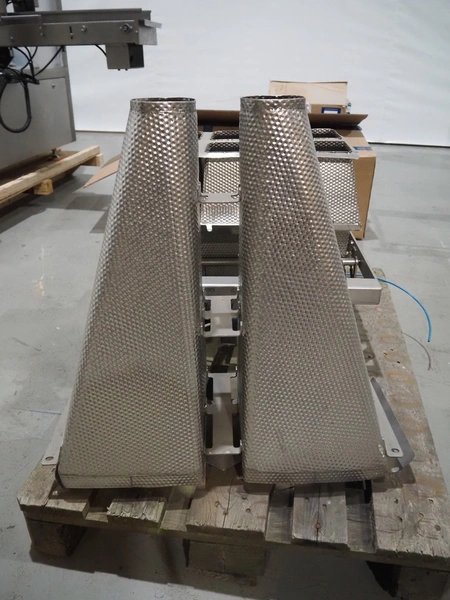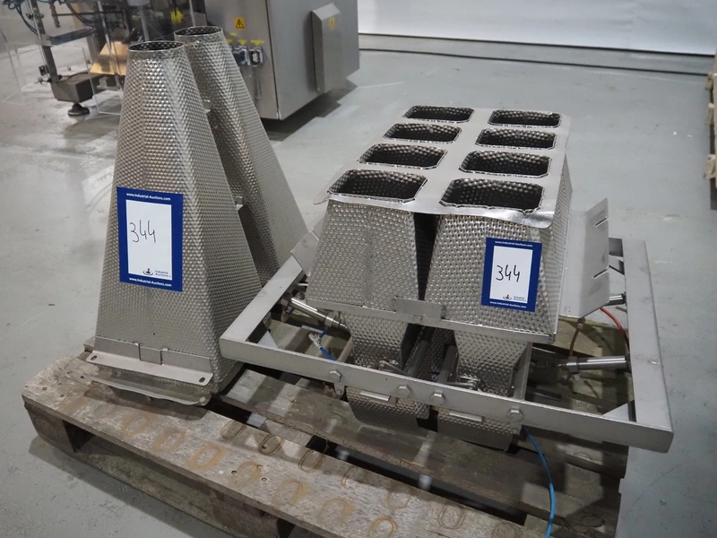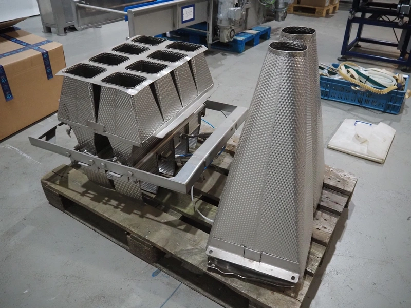 Pallet with parts for multihead weigher, 2 s/s outfeed cones and 8-heads sorter, dimensions: 1200 mm x 800 mm x 900 mm.