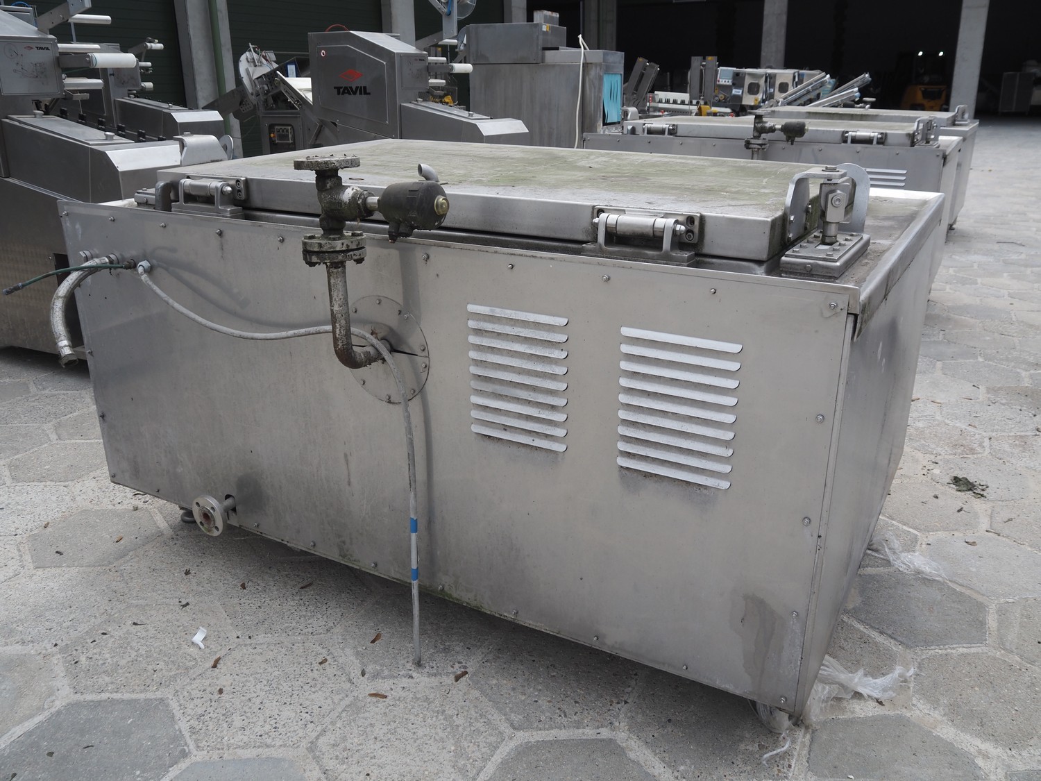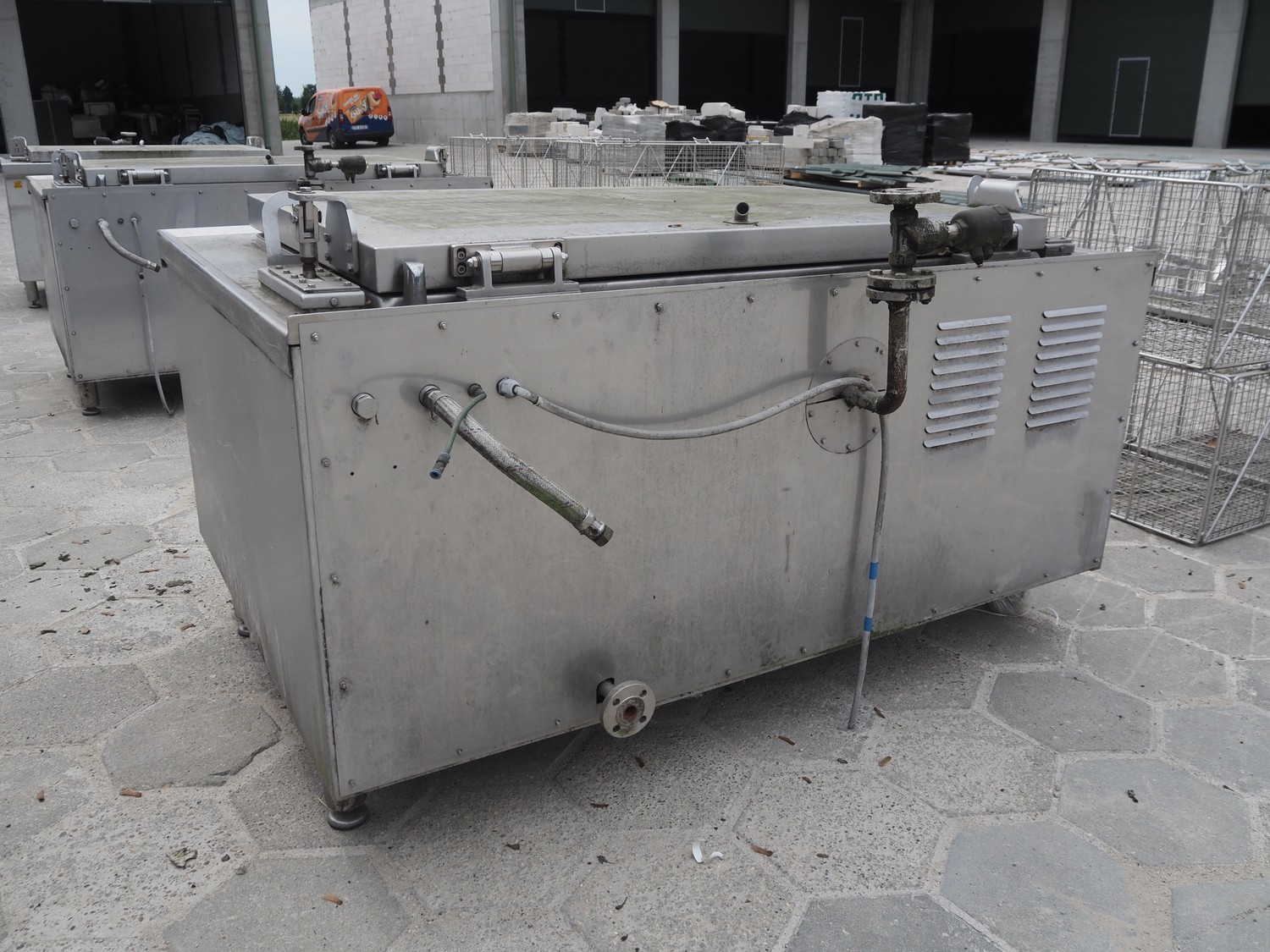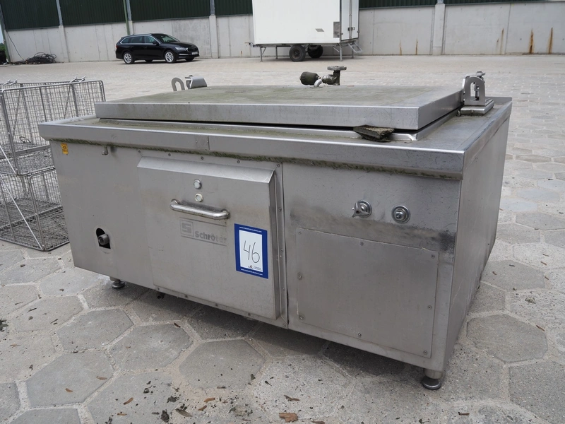 Schröter cooking vessel, inside dimensions: 1490 mm x 900 mm x 550 mm, total dimensions: 1900 mm x 1600 mm x 1120 mm. Including baskets, dimensions basket: (2x) 1340 mm x 690 mm x 520 mm.
